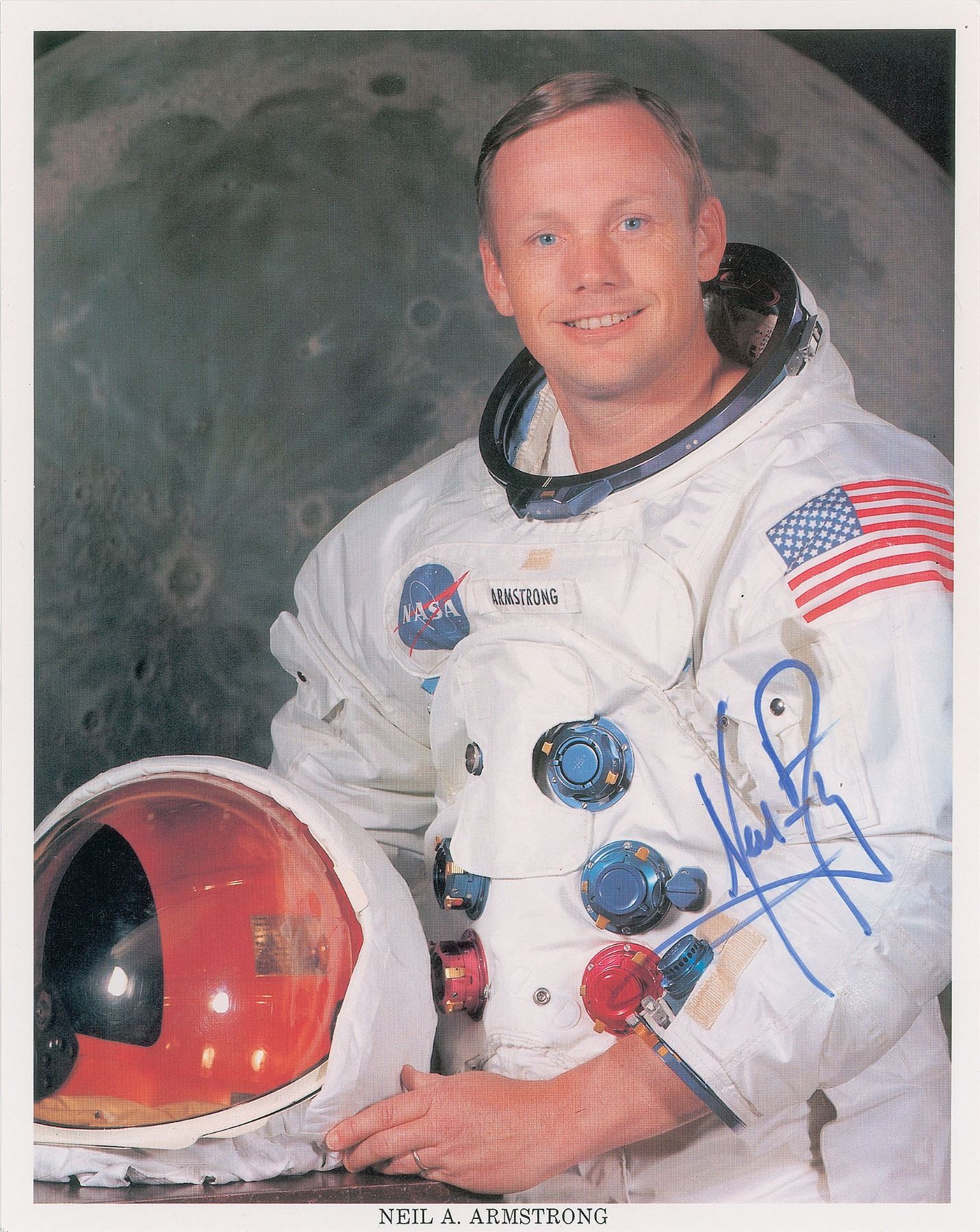Extremely desirable official color 8 x 10 NASA lithograph of Armstrong posing in his white space suit against a lunar backdrop, boldly signed in blue felt tip. In very good to fine condition, with a moderate horizontal bend across the center of the photo, and a light paperclip impression to the top edge. Accompanied by the original NASA transmittal envelope. Uninscribed Armstrong white space suit lithographs are considered a pinnacle of space autograph collecting, and this example boasts a particularly strong, bold signature.