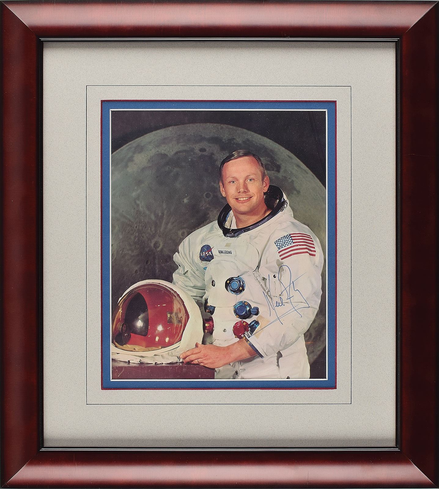 Desirable uninscribed official color 8 x 10 NASA lithograph of Armstrong posing in his white space suit against a lunar background, signed in blue felt tip. Nicely triple-matted and framed behind UV-protective glass to an overall size of 14.75 x 16.75. In fine condition.