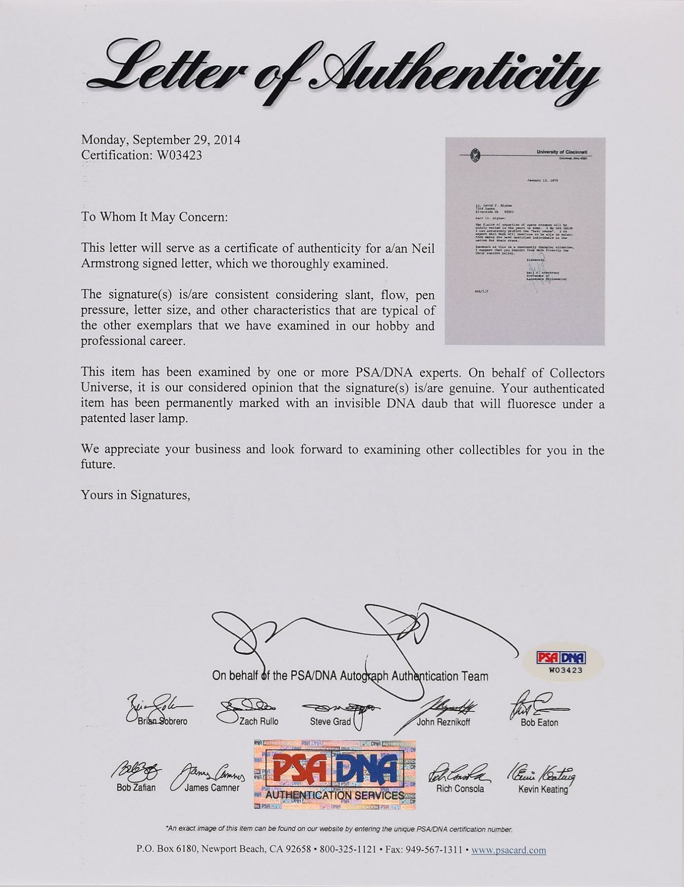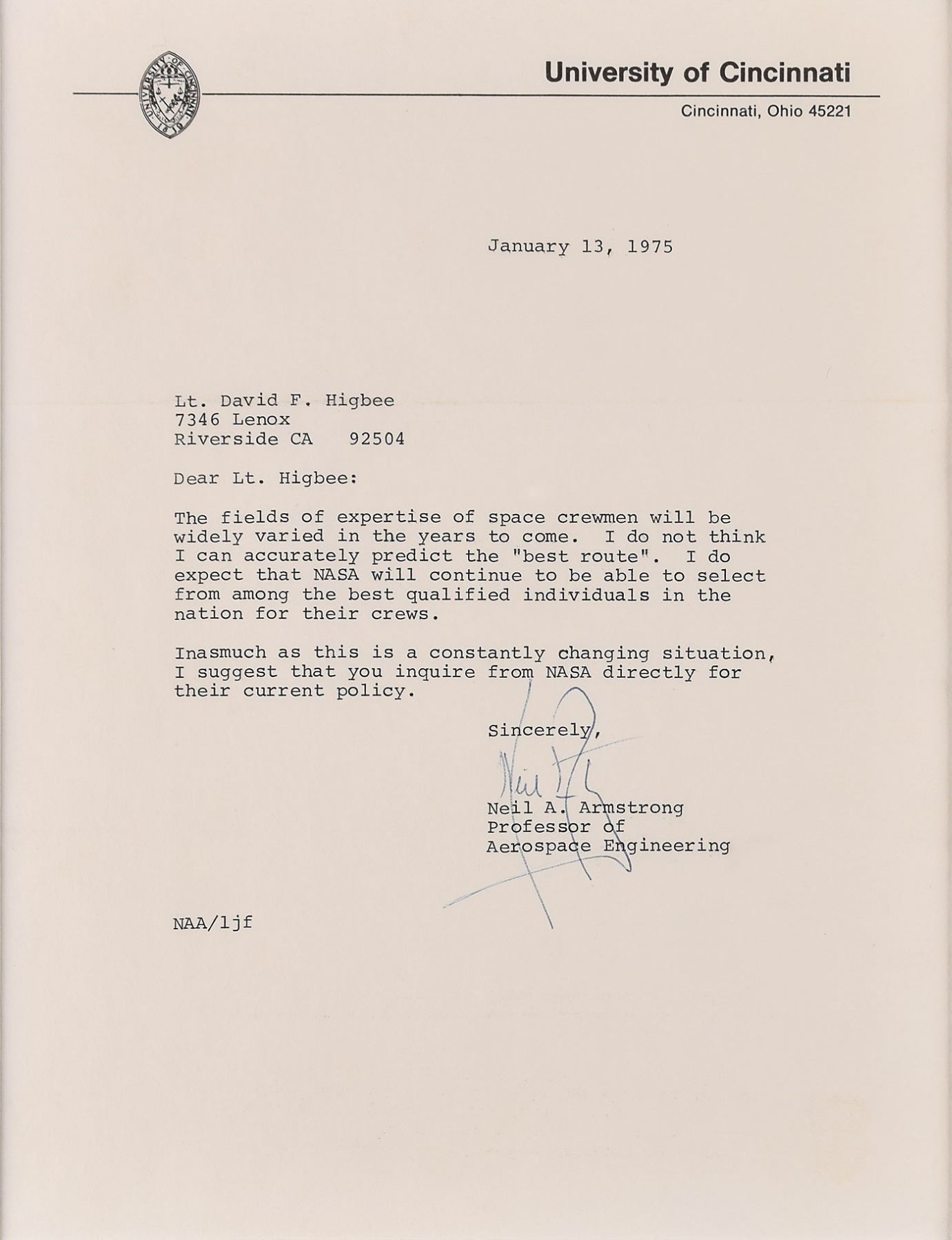 TLS, one page, 8.25 x 10.75, University of Cincinnati letterhead, January 13, 1975. Letter to Lt. David F. Higbee, in full: "The fields of expertise of space crewmen will be widely varied in the years to come. I do not think I can accurately predict the 'best route.' I do expect that NASA will continue to be able to select from among the best qualified individuals in the nation for their crews. Inasmuch as this is a constantly changing situation, I suggest that you inquire from NASA directly for their current policy." Nicely matted and framed with a white space suit portrait and engraved plaque to an overall size of 22.5 x19. In very fine condition. Accompanied by a full letter of authenticity from PSA/DNA.