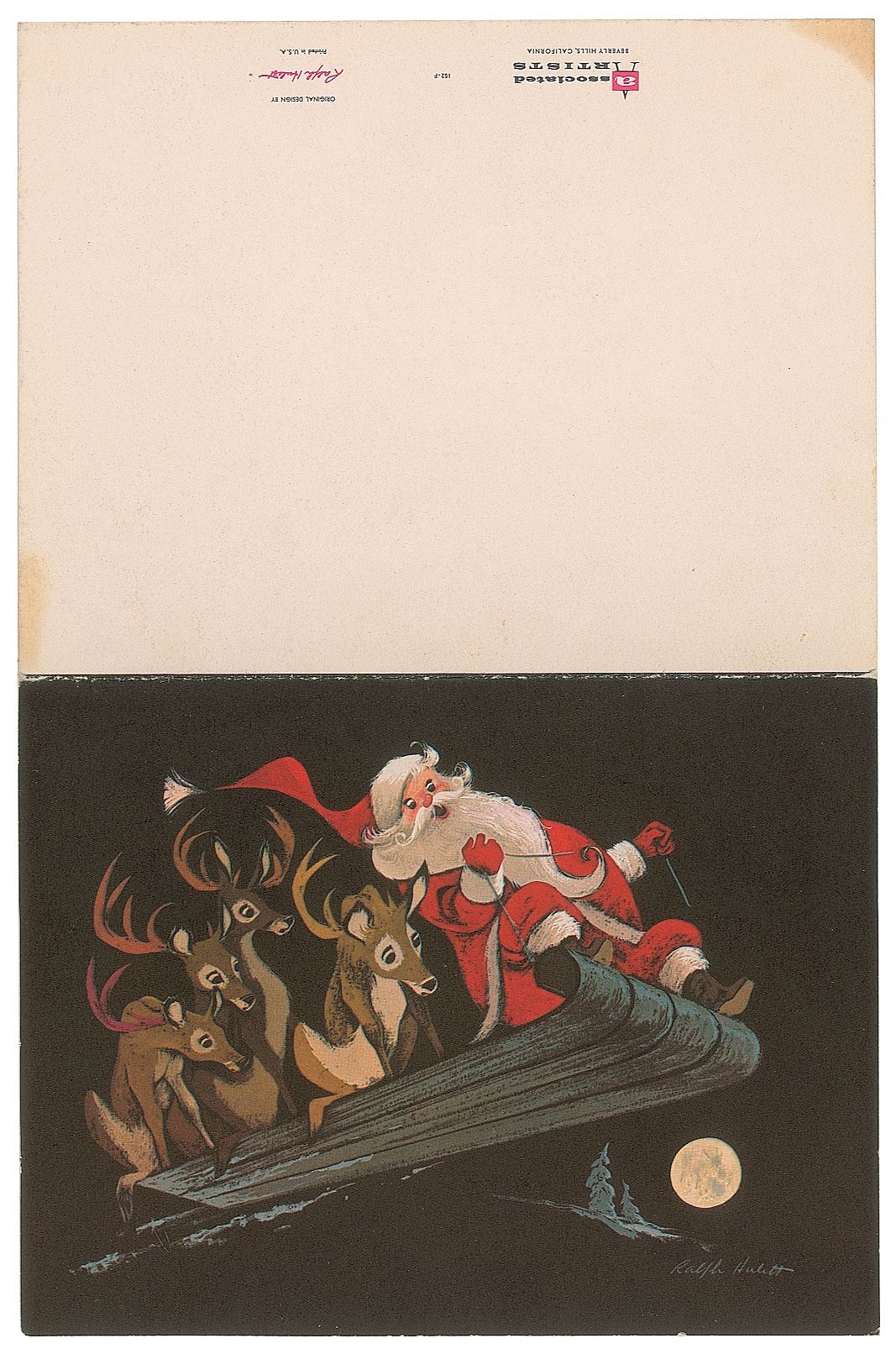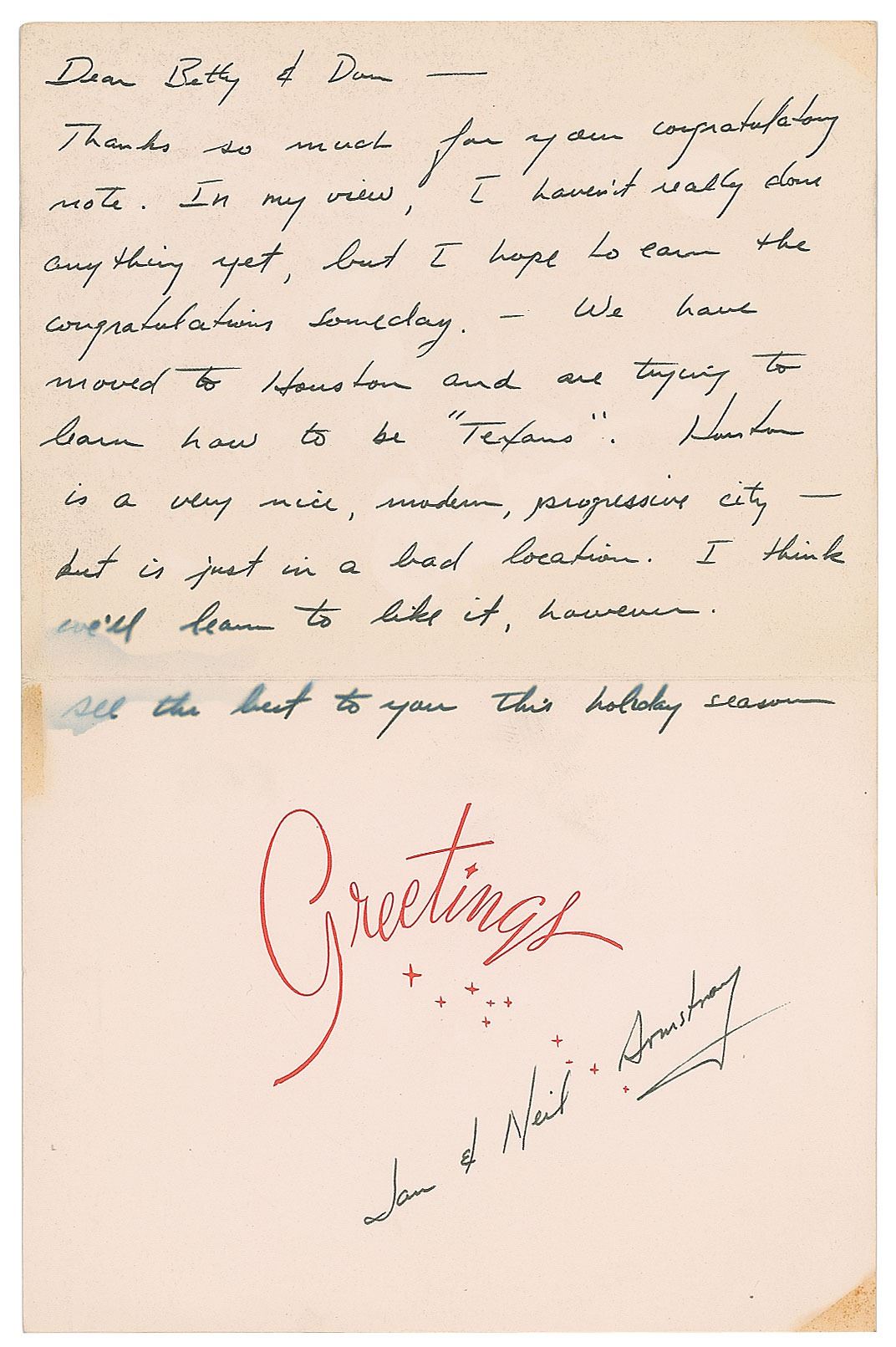 ALS signed by Neil Armstrong, “Jan & Neil Armstrong,” penned inside a Christmas card, measuring 6.5 x 10 unfolded, no date, but circa December 1962. Letter to Betty and Dan, in full: "Thank so much for your congratulatory note. In my view, I haven't really done anything yet, but I hope to earn the congratulations someday. We have moved to Houston and are trying to learn how to be 'Texans.' Houston is a very nice, modern, progressive city—but is just in a bad location. I think we'll learn to like it, however. All the best to you this holiday season." In fine condition, with two small areas of toning, and a small section of dampstaining along the left side of the hinge, touching four words of text. Selected to the NASA Astronaut Corps as part of Group 2 in September 1962, Armstrong and his family moved to Houston, settling in the Clear Lake area of El Lago. There he trained to become an astronaut, making his first spaceflight four years later on Gemini 8. At the end of the decade, he would earn the congratulations of millions around the world when he became the first to set foot on the moon as commander of Apollo 11.