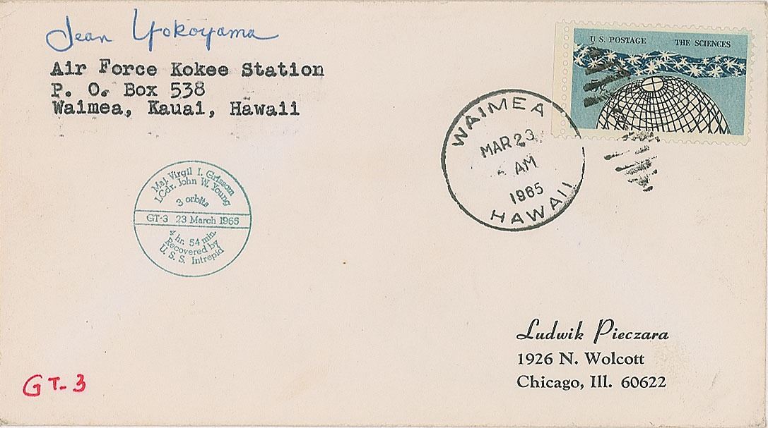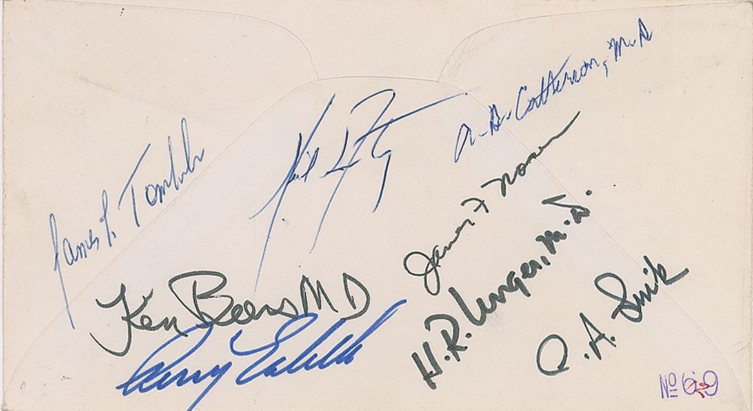 Early and sought-after Hawaiian tracking station cover, postmarked at Waimea, Hawaii, on the day of the Gemini 3 flight, March 23, 1965, signed on the reverse in blue ballpoint by Neil Armstrong. Also signed in ballpoint and felt tip by various other tracking station personnel, including NASA doctors A. D. Catterson and Ken Beers. In fine condition. Neil Armstrong was assigned to the Kokee Tracking Station in Hawaii for support of GT-3, the first manned flight of the Gemini program, undertaken by Gus Grissom and John Young aboard the 'Molly Brown.'