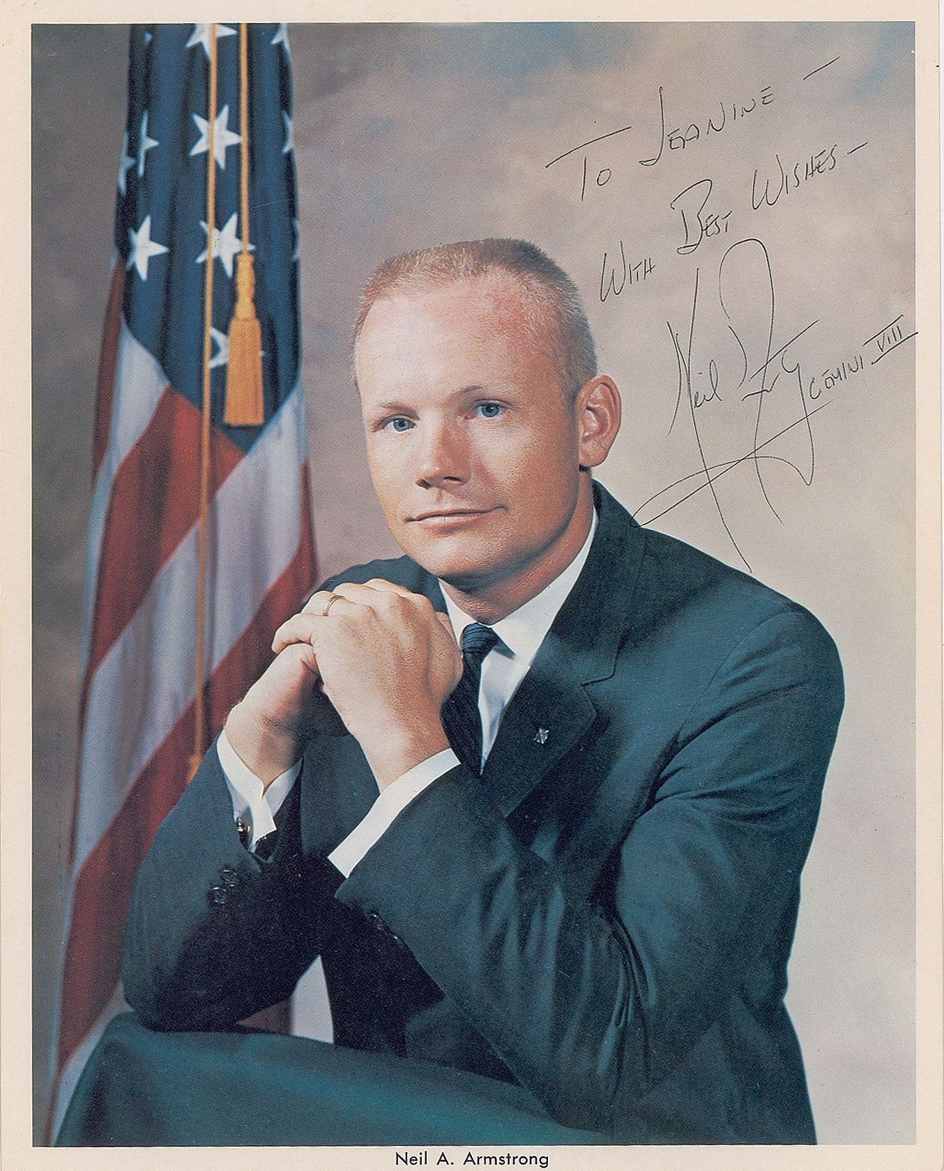 Official color 8 x 10 NASA lithograph of Armstrong in a formal pose, his lapel bearing an astronaut pin, signed and inscribed in black ballpoint, "To Jeanine—with best wishes—Neil Armstrong, Gemini VIII.” In very fine condition. Recipient was an employee at the Los Angeles International Airport who assisted astronauts with picking up their GSA vehicles circa 1967.