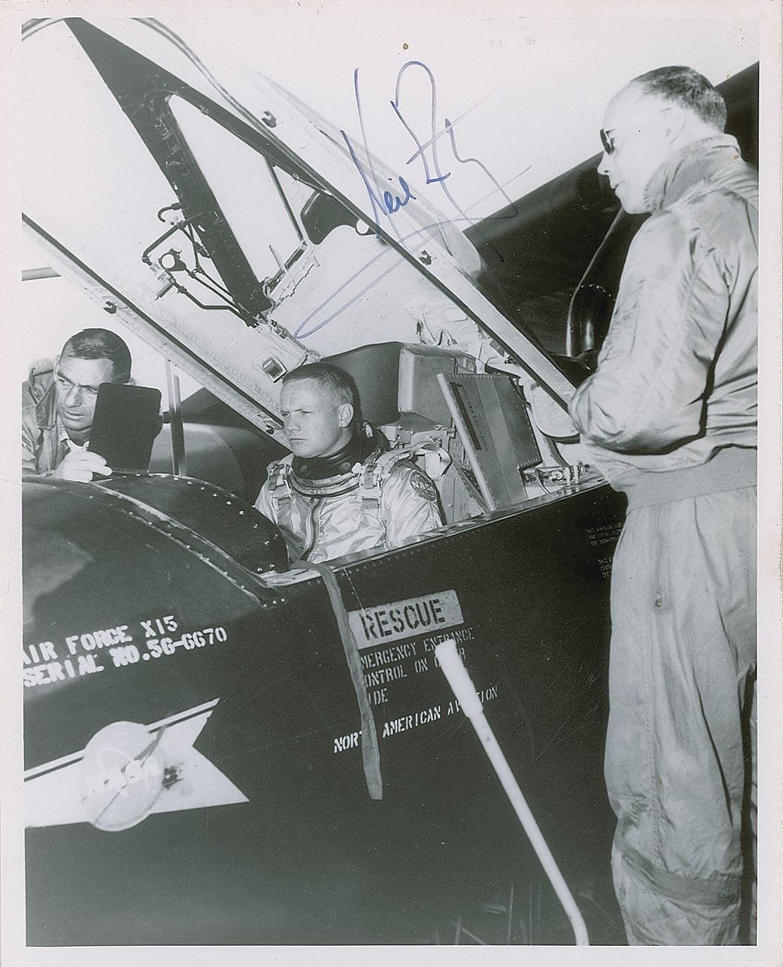 Excellent glossy 8 x 10 photo of Neil Armstrong in the cockpit of a North American X-15 spaceplane, signed in black felt tip. In very good to fine condition, with scattered light creasing, a light paperclip impression to the top edge, and light surface impressions at the bottom from a pencil notation on the back.