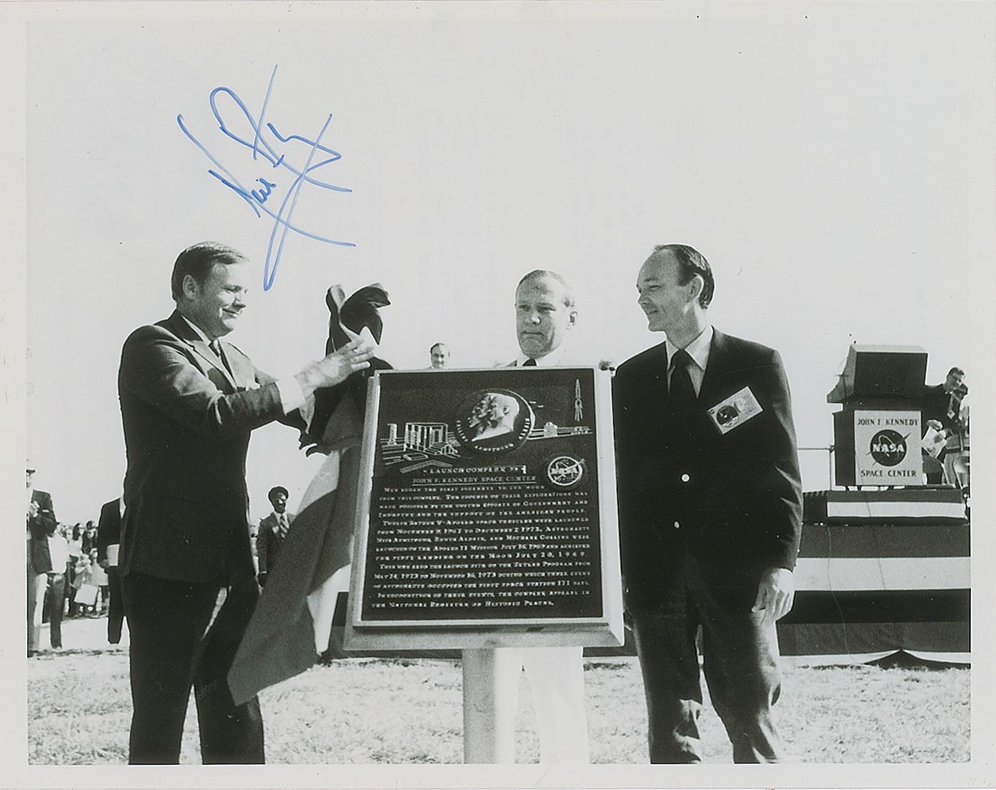 Desirable official glossy 10 x 8 NASA photo of Neil Armstrong, Buzz Aldrin, and Michael Collins unveiling a Launch Complex 39 commemorative plaque on the fifth anniversary of the launch of the Apollo 11 mission, signed in black felt tip by Armstrong. Reverse bears purple NASA caption text. In fine condition, with a couple of small surface creases. An uncommon image capable of becoming a fully signed rarity.