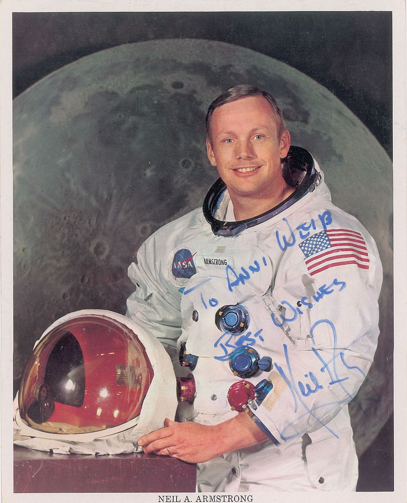 Official color 8 x 10 NASA lithograph of Armstrong in his white space suit against a lunar backdrop, signed and inscribed in blue felt tip, "To Anni Weiss, Best Wishes, Neil Armstrong.” In fine condition, with a few small surface creases.