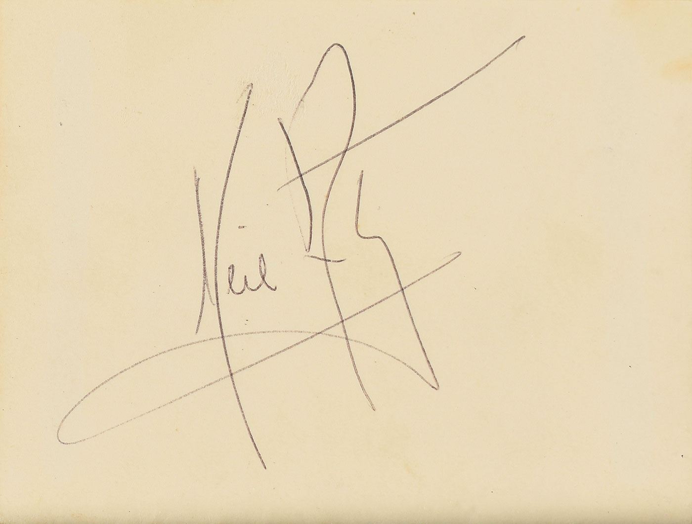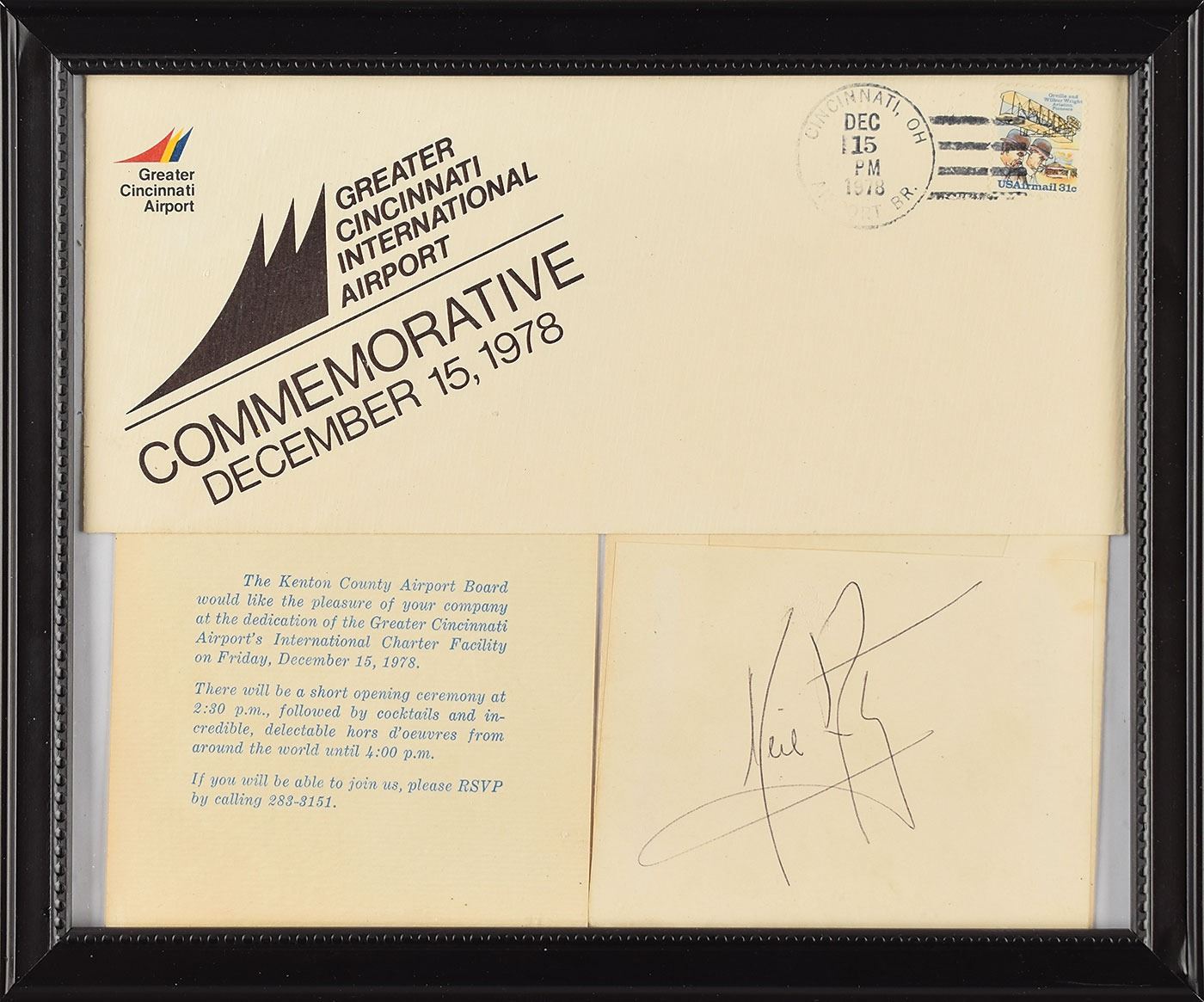 Crisp ballpoint signature, "Neil Armstrong,” on an off-white 4.5 x 3.5 envelope. Framed with a Greater Cincinnati International Airport commemorative cover and an invitation to the dedication of the airport's new facility on December 15, 1978, to an overall size of 11 x 9. In fine condition. Accompanied by a letter of provenance from the original recipient: "In December of 1978 I was working as a marketing/sales consultant for the Hamilton Journal News a local daily newspaper. I was asked to help in the marketing dept. of the Cincinnati International Airport in conjunction with the newspaper to develop advertising and marketing material for the upcoming dedication of the new…charter facility to be opened in on December 15 of 1978. After attending the opening ceremony, I was able to meet Mr. Armstrong while mingling with guests at the party afterwards. At the time, Mr. Armstrong was a current member of the board of directors of the Cincinnati International Airport. I approached Mr. Armstrong with my invitation to the event and asked if he would sign his autograph. With a rather stern look on his face he quickly said 'No.' I apologized, told him I was sorry to have bothered him but the autograph was not for me but for my wife who is a school teacher and wanted it to show her 8th grade science class students to any potential future astronauts. He took the invitation, quickly signed, handed it back without a word being said. I thanked him and walked away."