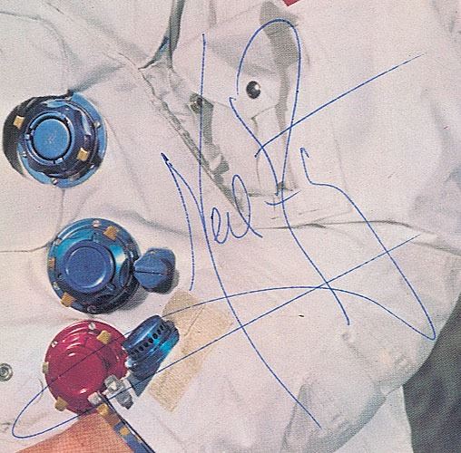 Official color 8 x 10 NASA lithograph of Neil Armstrong posing in his white space suit against a lunar backdrop, signed in blue ballpoint. In fine condition, with some minor surface loss along the back top edge.