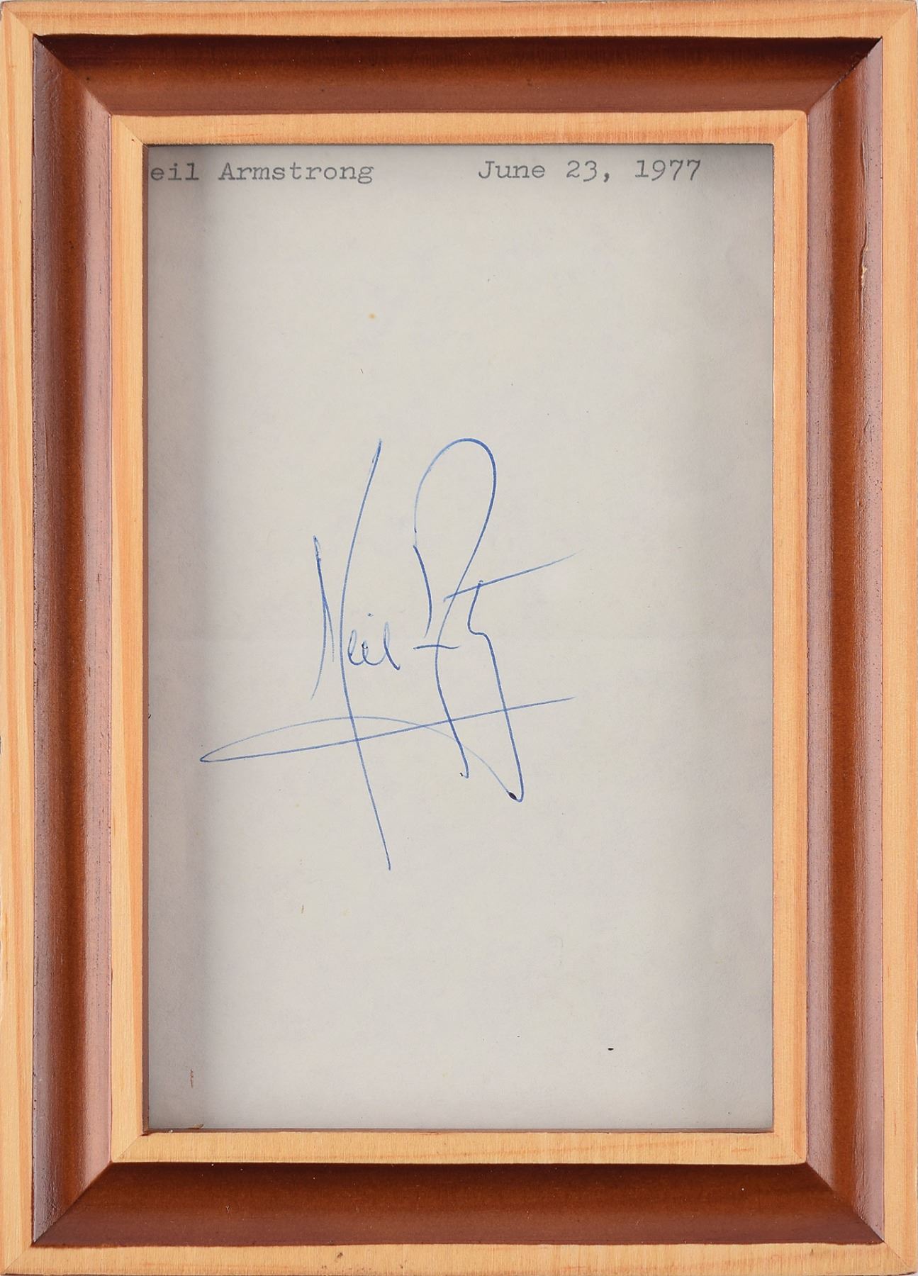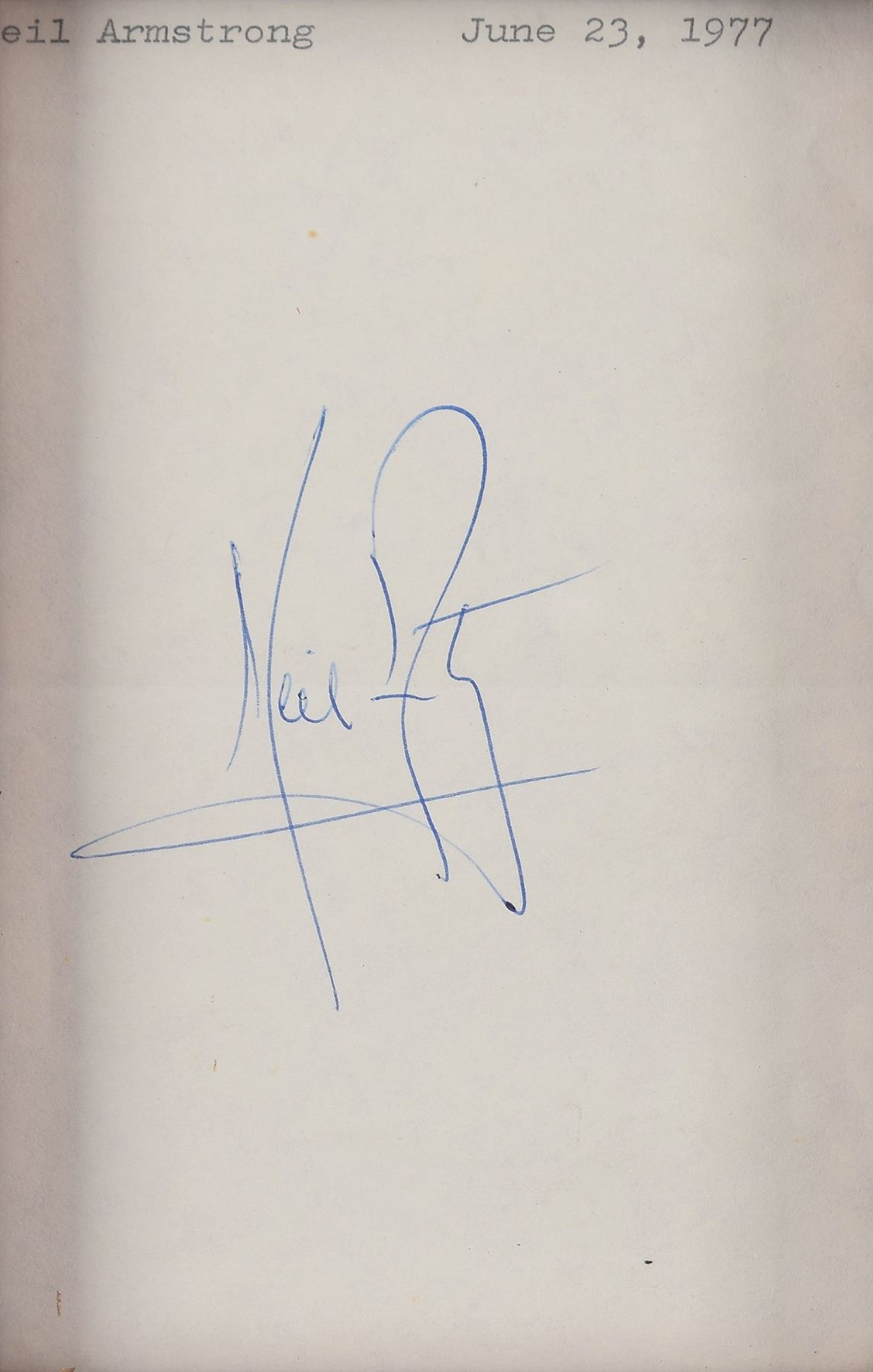 Crisp ballpoint signature, "Neil Armstrong,” on an off-white 3.5 x 5.5 sheet with typed notation dating the signature to June 23, 1977. Framed to a slightly larger size. In very good to fine condition, with light creasing, and a central horizontal fold passing through the signature.