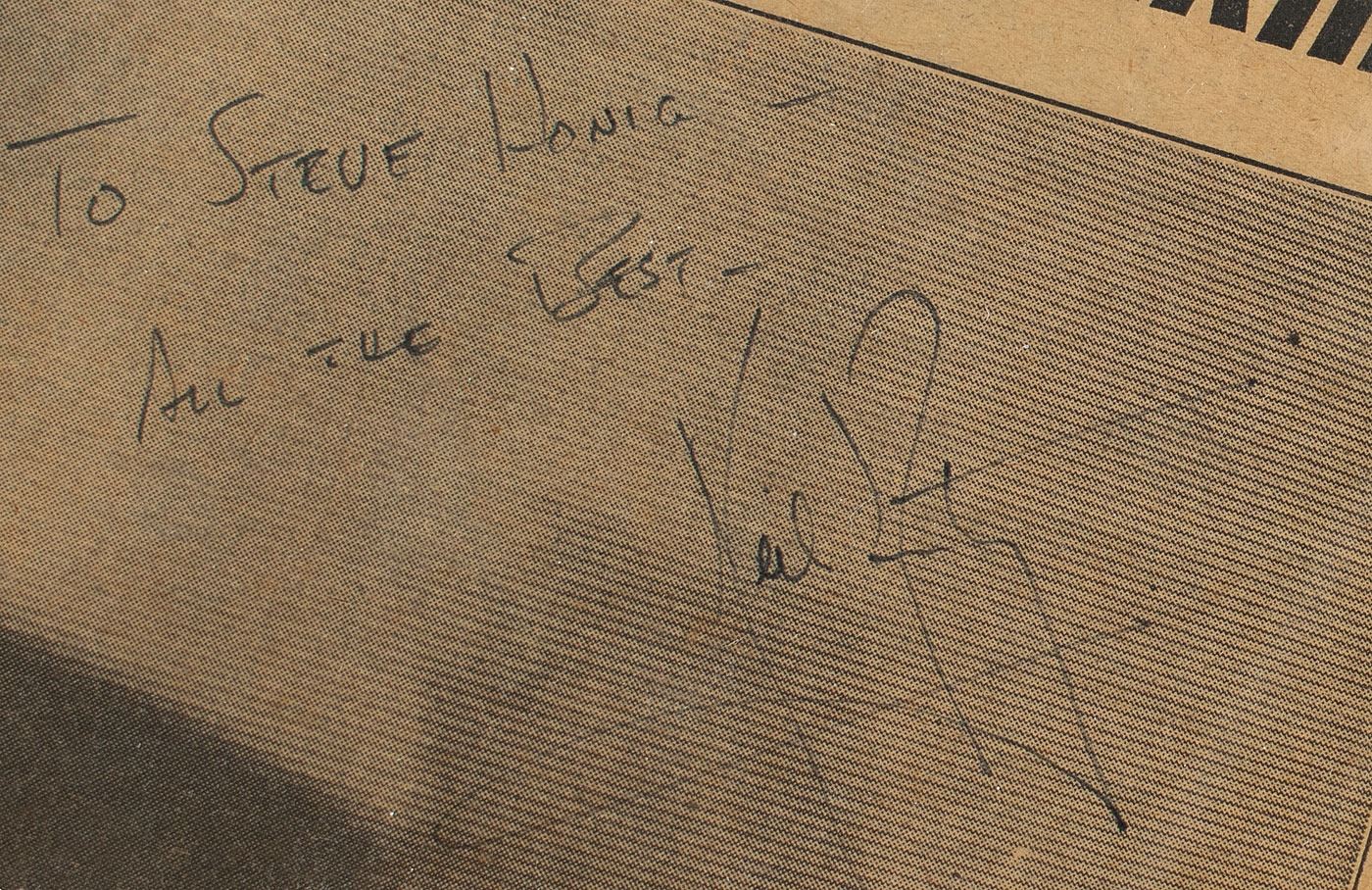 Original issue of the New York Daily News from "Moonday, July 21, 1969," Long Island Final edition, Vol. 51, No. 22, 64 pages, 10.5 x 15.25, signed and inscribed on the front cover in black ink, "To Steve Honig—All the best—Neil Armstrong." Above the rare image—one showing Armstrong walking on the moon—is a subhead featuring Armstrong's iconic words: "One Small Step for Man… One Giant Leap for Mankind." In very good to fine condition, with wear and small tears along the spine, and expected fragility from age. Accompanied by a full letter of authenticity from JSA.