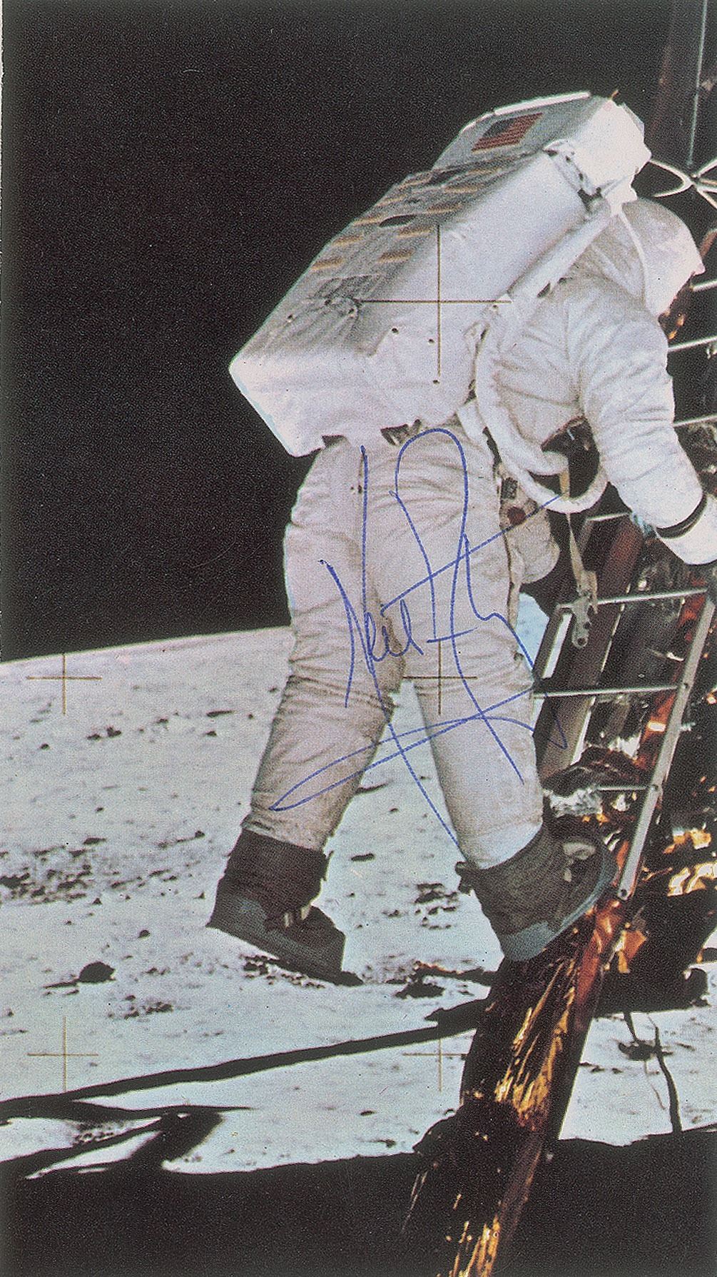 Trimmed 3.5 x 6.5 section of an official color NASA lithograph of Buzz Aldrin descending to the lunar surface, signed in blue ballpoint by the photographer, "Neil Armstrong." In fine condition.