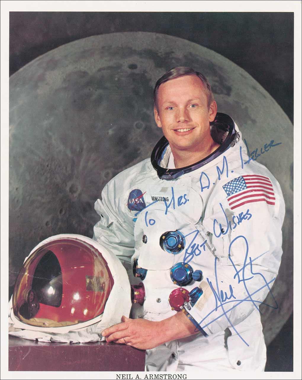 Color 8 x 10 NASA photo of Armstrong in his flight suit posing against a lunar background, signed and inscribed in blue felt tip “To Mrs. A. M. Heller, Best wishes, Neil Armstrong.” In fine condition, with a light crease to left edge and lower right corner tip.