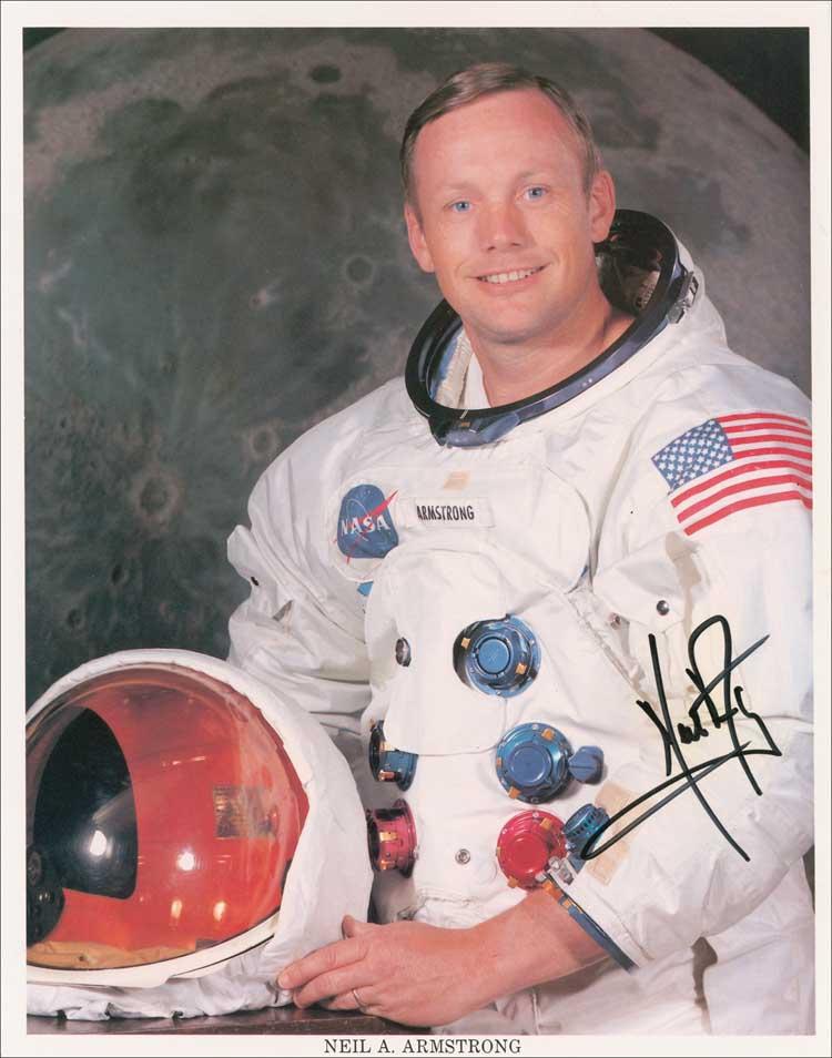 Color 8 x 10 NASA photo of Armstrong in his white space suit standing in front of a lunar background, signed in black felt tip. In fine condition, with faint haloing to the signature and trivial bends to the upper right corner. Uninscribed photos of Armstrong represent one of the most coveted and elusive prizes in the entire field of space collecting. Pre-certified Scott Cornish and RRAuction COA.