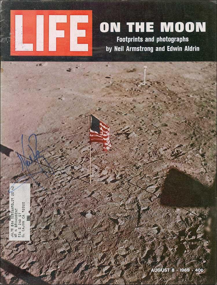 Complete August 8, 1969, issue of Life magazine, featuring “Footprints and photographs by Neil Armstrong and Edwin Aldrin,” signed on the front cover in blue felt tip by Armstrong. Accompanied by the return receipt from Armstrong’s University of Cincinnati address, signed by a staff member and dated June 26, 1980. In fine condition, with mailing label affixed to lower left, some mild rippling, and a bit of light spotting to top left. Pre-certified Scott Cornish and RRAuction COA.