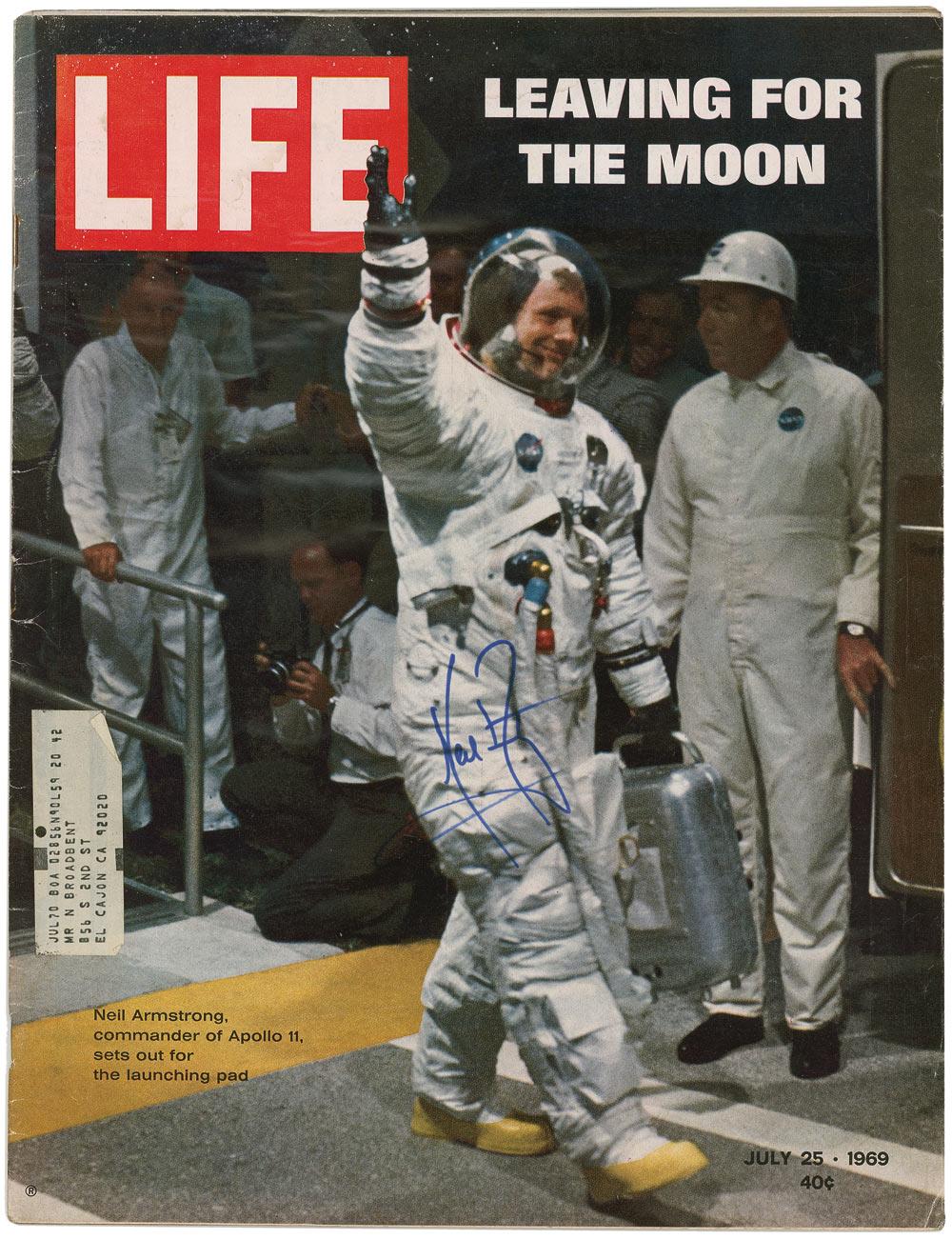 Complete July 25, 1969, issue of Life magazine, featuring the headline “Leaving for the Moon,” signed on the front cover in blue felt tip by Armstrong. In fine condition, with mailing label affixed to lower left, some mild rippling, and a bit of light spotting to top left. Pre-certified Scott Cornish and RRAuction COA.