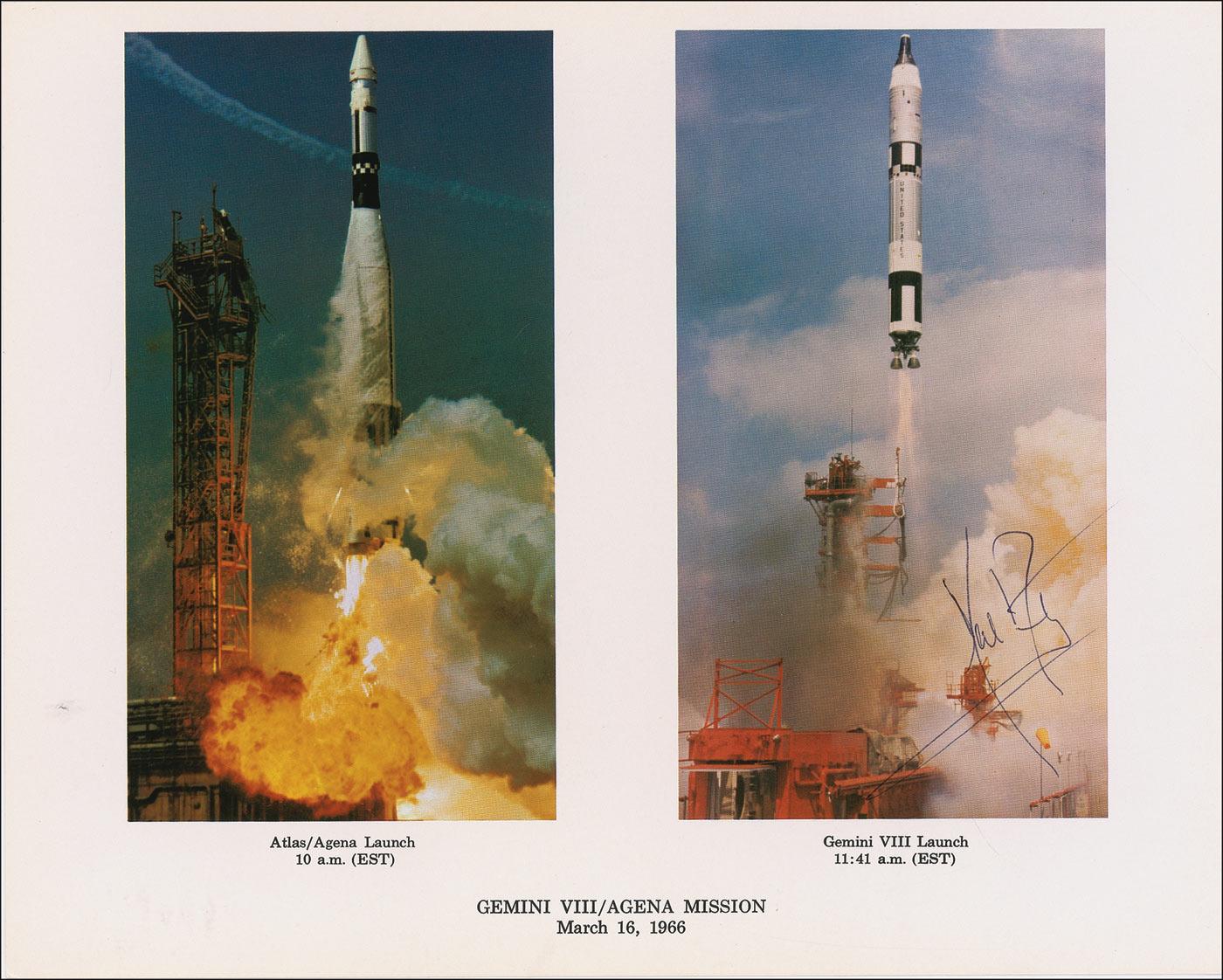 Color 10 x 8 composite cardstock photo of the launch of the Gemini VIII capsule and Agena, signed in blue ballpoint by Armstrong. In very fine condition. Pre-certified Scott Cornish and RRAuction COA.