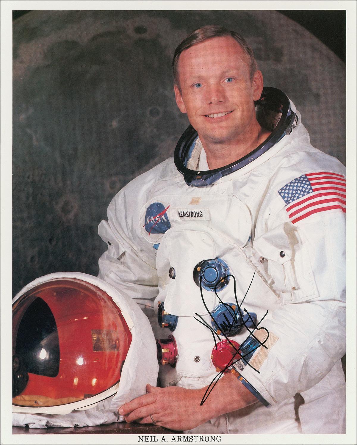 Superb color 8 x 10 NASA photo of Armstrong posing in his spacesuit against a lunar background, signed in black felt tip. In very fine condition. Uninscribed photos of Armstrong represent one of the most coveted and elusive prizes in the entire field of space collecting. Pre-certified Scott Cornish and RRAuction COA.