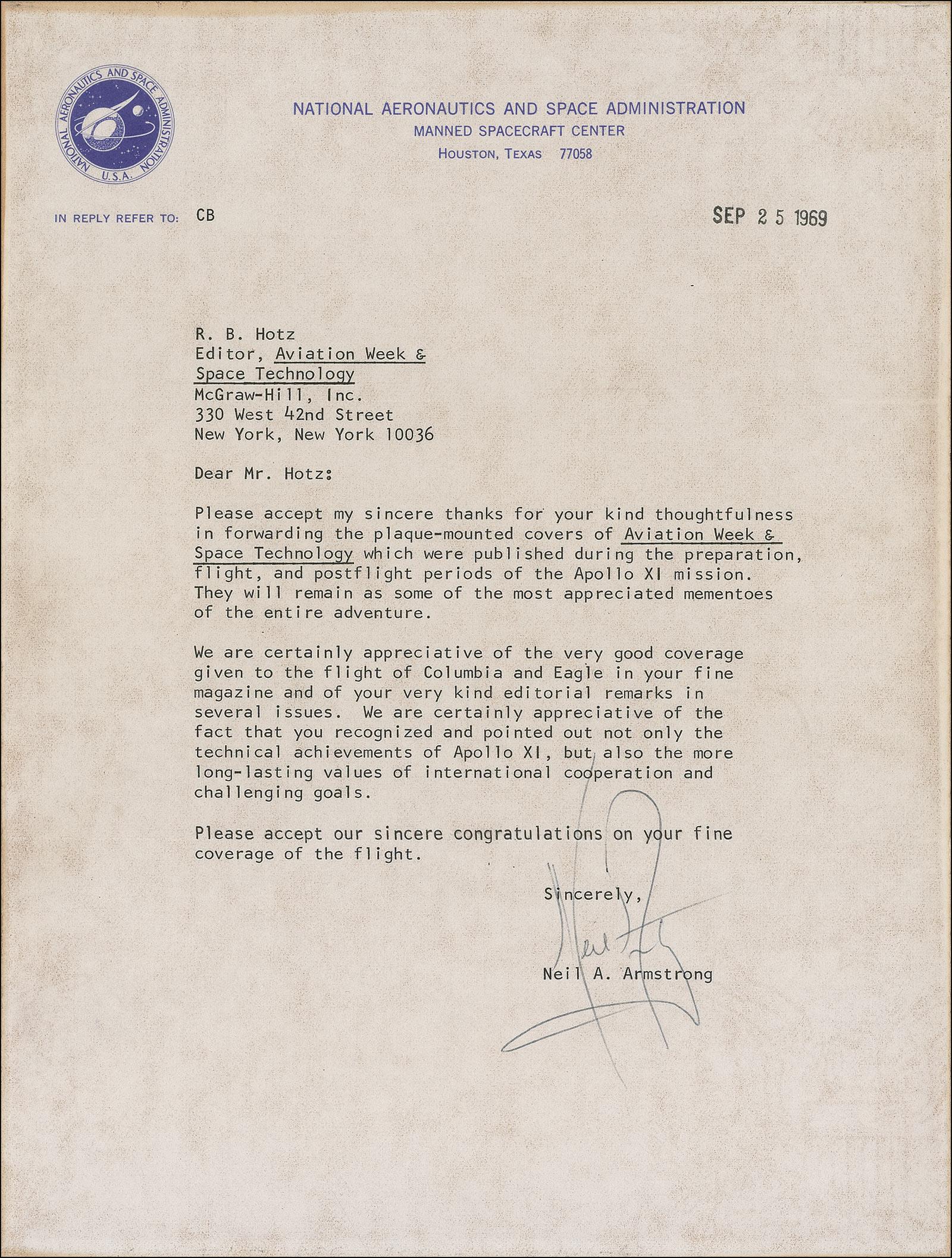 A full sheet of 32 ten-cent first man on the moon airmail stamps, 9 x 10, signed in ink at the very edge of the right selvage. Stamp sheet is housed in a commemorative presentation folder belonging to United States Senator Harry F. Byrd, Jr. In fine condition, with ink slightly faded. Pre-certified Scott Cornish and RRAuction COA.