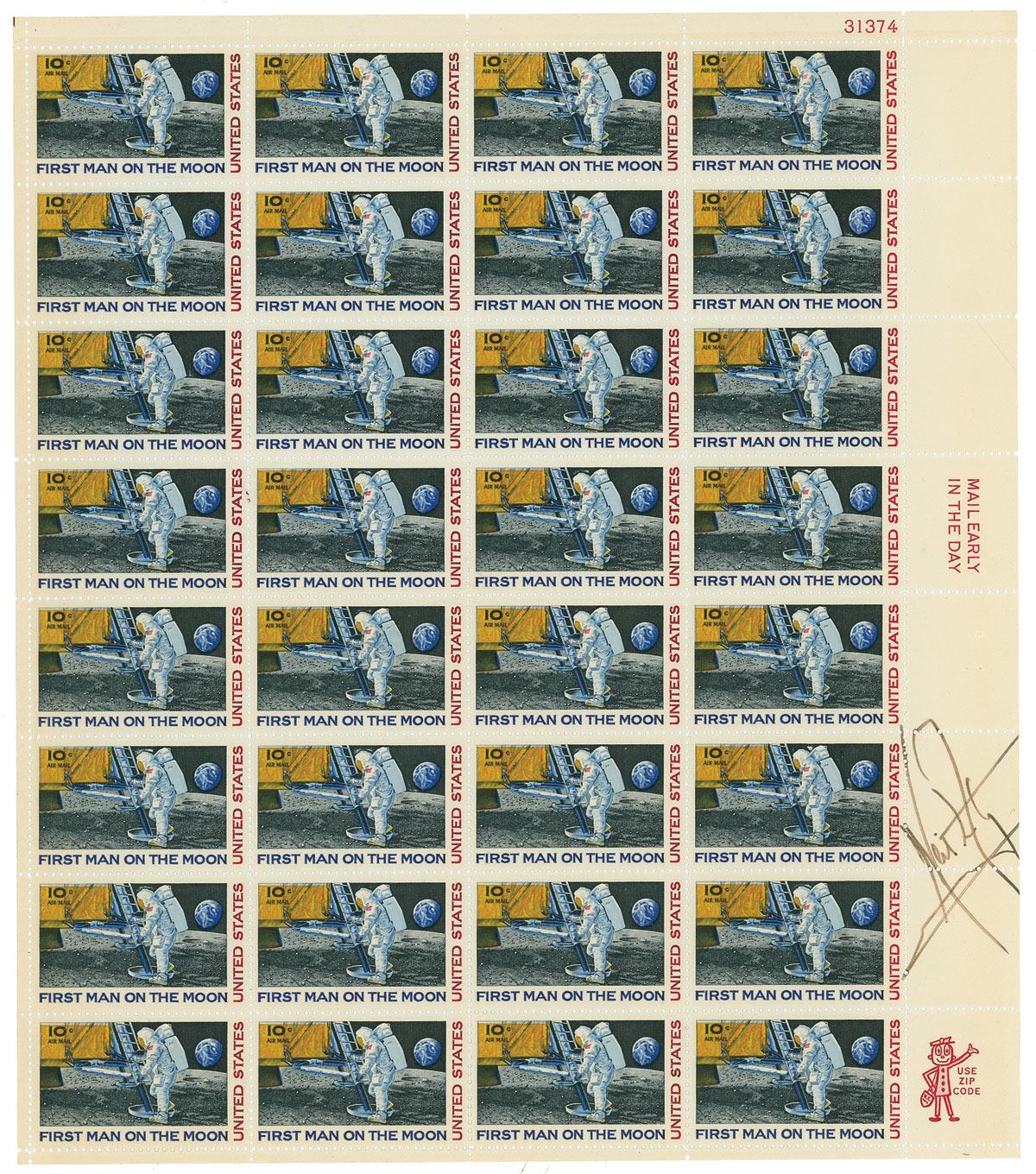 “We are certainly appreciative of the very good coverage given to the flight of Columbia and Eagle in your fine magazine and of your very kind editorial remarks in several issues. We are certainly appreciative of the fact that you recognized and pointed out not only the technical achievements of Apollo XI, but also the more long-lasting values of international cooperation and challenging goals. Please accept our sincere congratulations on your fine coverage of the flight.” In very good condition, permanently affixed to an identical size board, with faint toning and mild overall soiling.