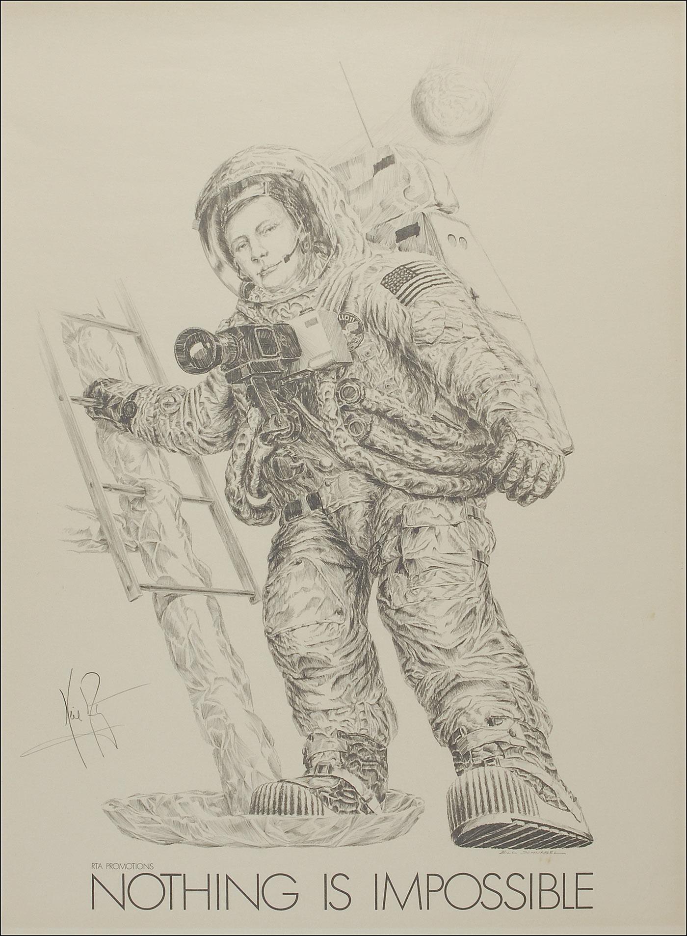 Unusual and uniquely detailed 17 x 22.5 print, entitled “Nothing Is Impossible,” depicting Armstrong stepping onto the lunar surface from the ladder of the lunar module, a camera strapped to his chest. Perfectly signed in pencil in the blank lower left area. Rolled and in fine condition, with a faint uniform overall shade of toning from previous display.