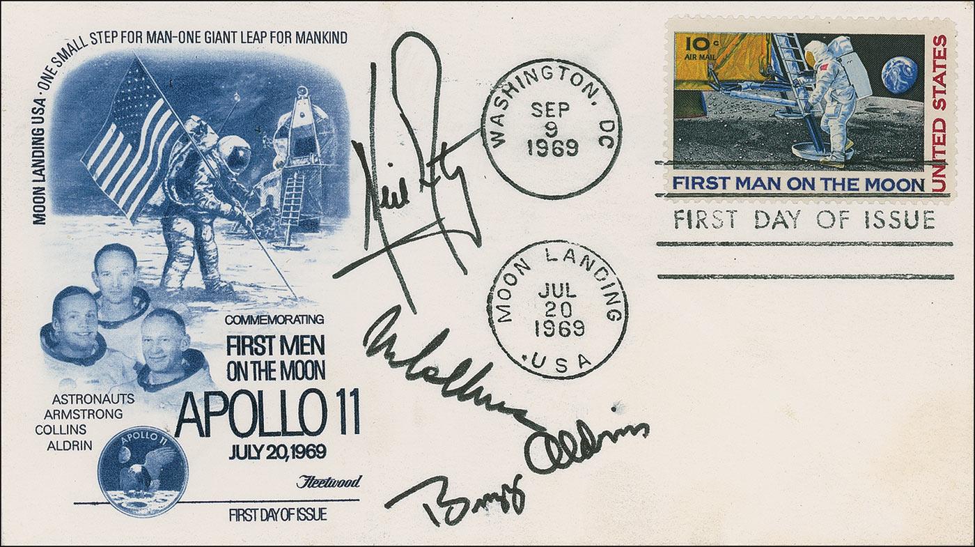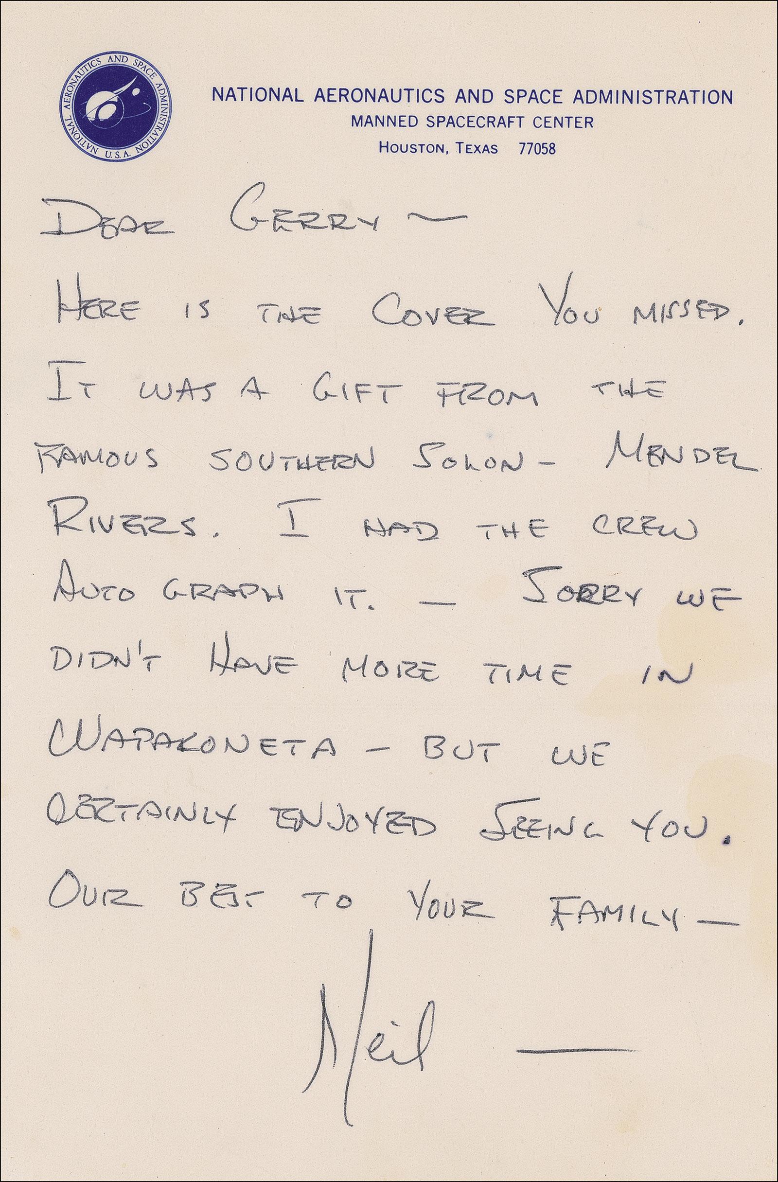 Exceedingly rare ALS, signed “Neil,” one page, 5.25 x 8, NASA letterhead, no date. Letter written to Gerry. In full: “Here is the cover you missed. It was a gift from the famous southern solon Mendel Rivers. I had the crew autograph it. Sorry we didn’t have more time in Wapakoneta but we certainly enjoyed seeing you. Our best to your family.” The first day cover Armstrong had autographed by his Apollo 11 crew, referenced in the letter, is present: Cachet honoring the Apollo 11 moon landing with images of Armstrong, Buzz Aldrin, and Michael Collins, a First Man on the Moon 10-cent stamp affixed, doubly cancelled “Moon Landing, USA, Jul 20 1969,” and “Washington, DC, Sep 9 1969.” Boldly signed in black “Neil Armstrong,” “Buzz Aldrin,” and “M Collins.” The original 8.5 x 11 stamp album page upon which the first day cover was placed is captioned: “Like the ‘Moonlanding Letter,’ the master die for the printing of the stamp was carried to the Moon by Apollo 11. As the astronauts and everything which they brought back from their journey had to undergo an eighteen days period in isolation–to avoid possible contamination of the Earth with ‘germs’ from the Moon–printing could not begin before the Middle of August.” In fine condition, with a few spots of mild toning, mainly to right edge. FDC also rates fine, with a bit of scattered light toning to lower right corner, and a slight brush to Aldrin’s signature.