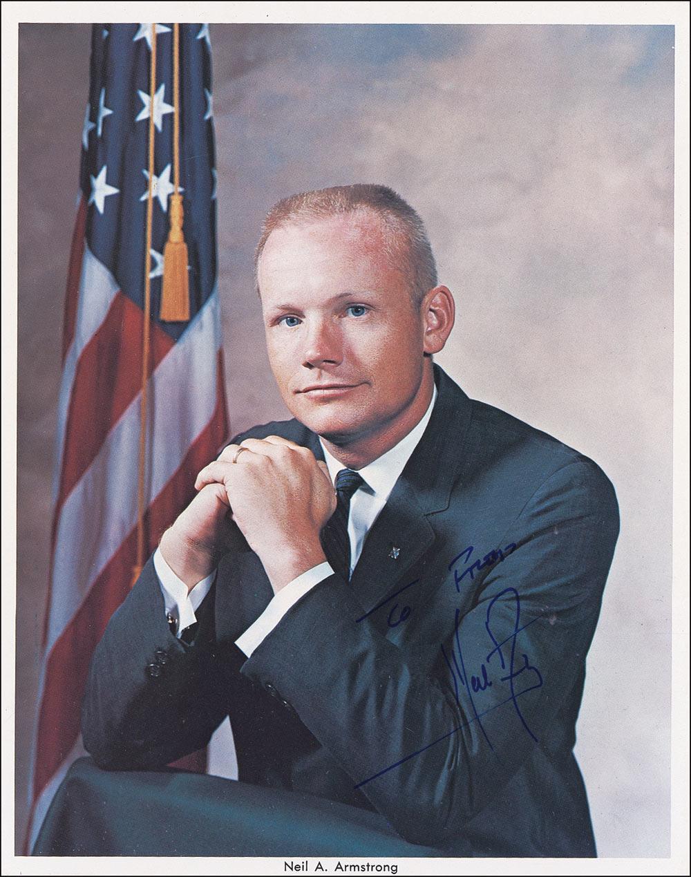 Color 8 x 10 NASA photo, an early pose with a neatly dressed Armstrong shortly after his astronaut selection in 1962, signed and inscribed later on in blue felt tip, “To Fred, Neil Armstrong.” In fine condition, with trivial light scattered creasing and moderate writing contrast.