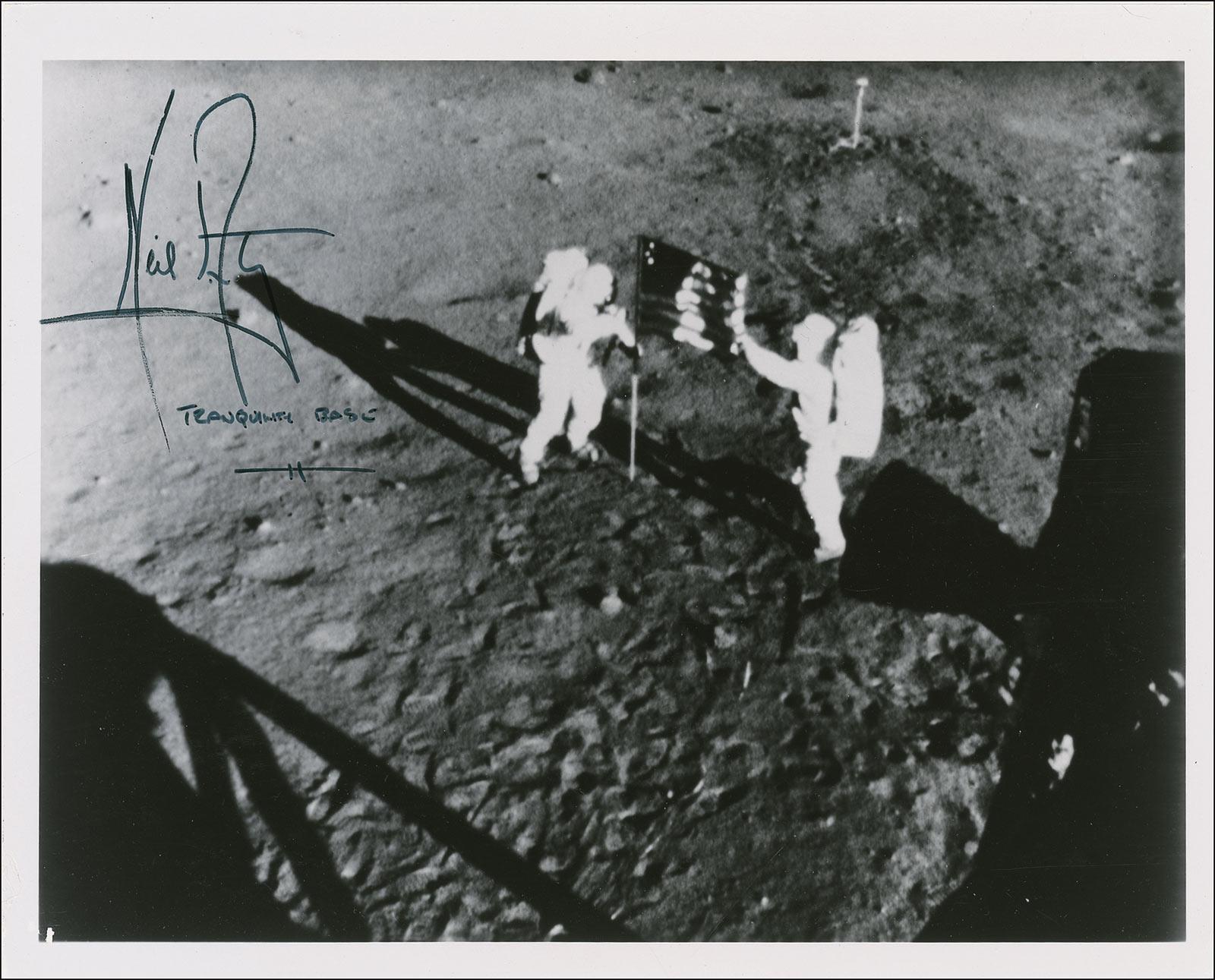 Rare glossy 10 x 8 photo of Armstrong and Buzz Aldrin setting up the American flag on the lunar surface, signed in black felt tip, “Neil Armstrong, Tranquility Base.” Some scattered light creases to image, and creasing and slight surface loss along left edge, otherwise fine condition.