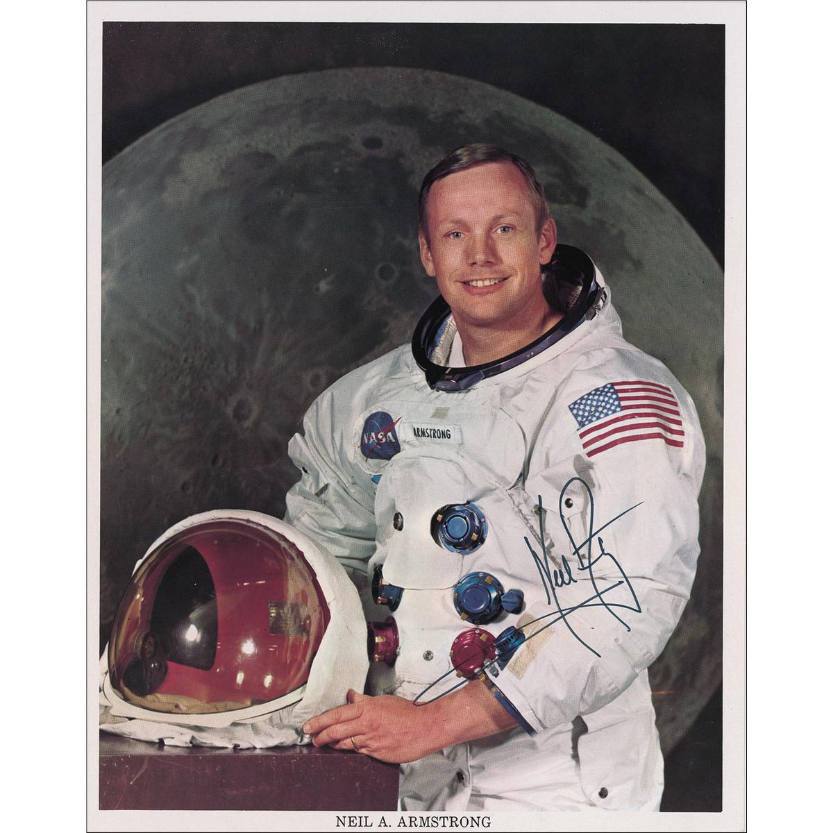 Desirable color 8 x 10 NASA photo of Armstrong posing in his spacesuit against a lunar background, signed in black felt tip. In fine condition, with a couple trivial creases to top left corner tip.