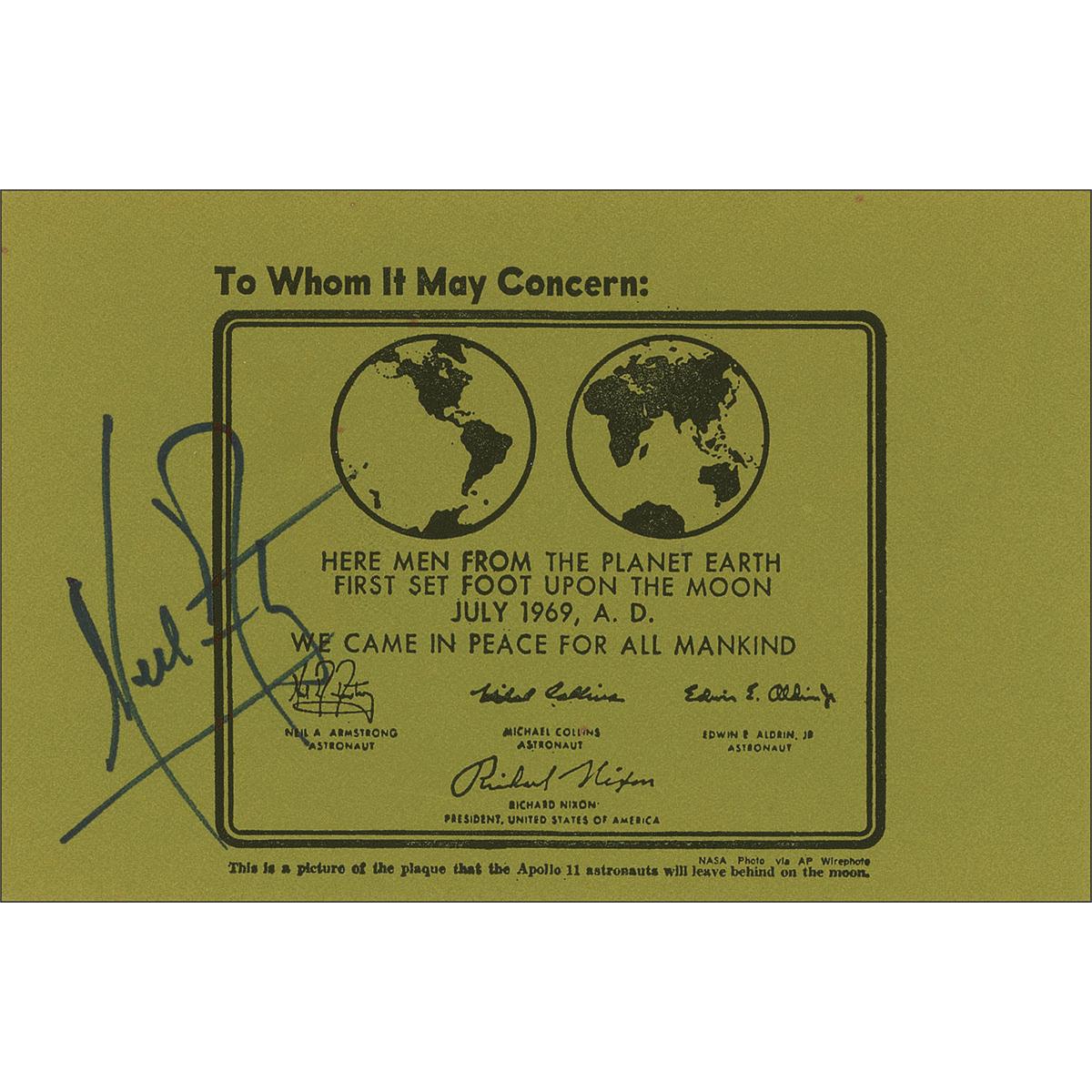 Felt tip signature, “Neil Armstrong,” on a light green 5.5 x 3.75 printed replica of the plaque Apollo 11 left on the surface of the moon. In very fine condition.