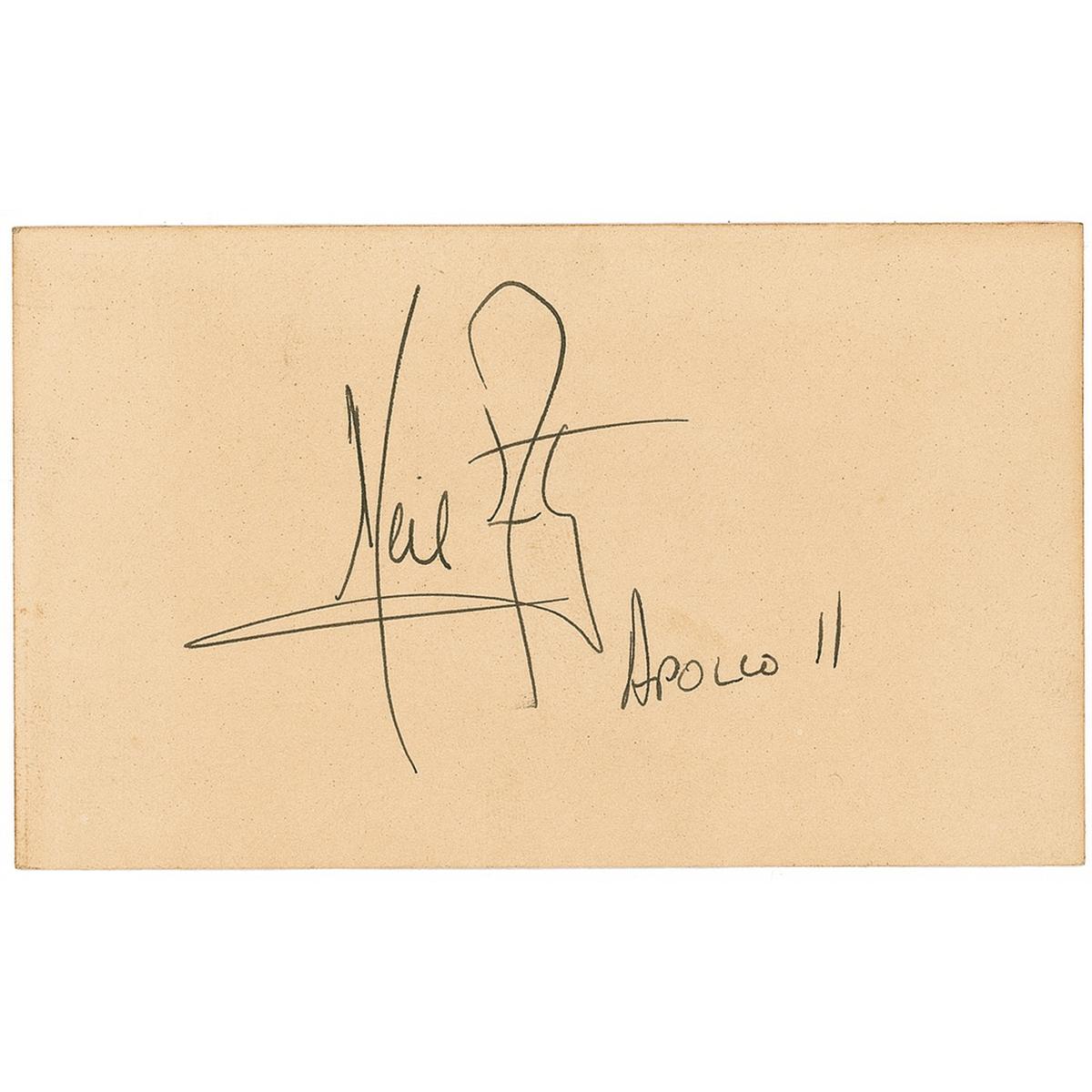 Ballpoint signature, “Neil Armstrong Apollo 11,” on an off-white 5 x 3 card. In fine condition. According to the consignor, the signature was obtained in early 1969.
