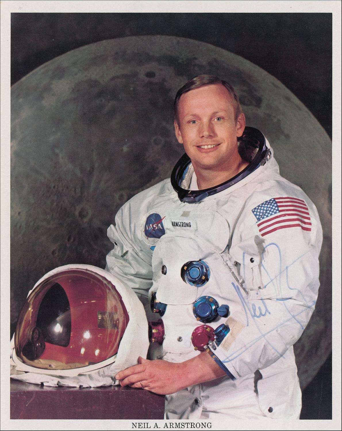 Color 8 x 10 NASA photo of Armstrong posing in his spacesuit against a lunar background, signed in blue felt tip. In fine condition, with a few scattered light creases and surface marks and Armstrong’s signature a couple shades light, but still completely legible.