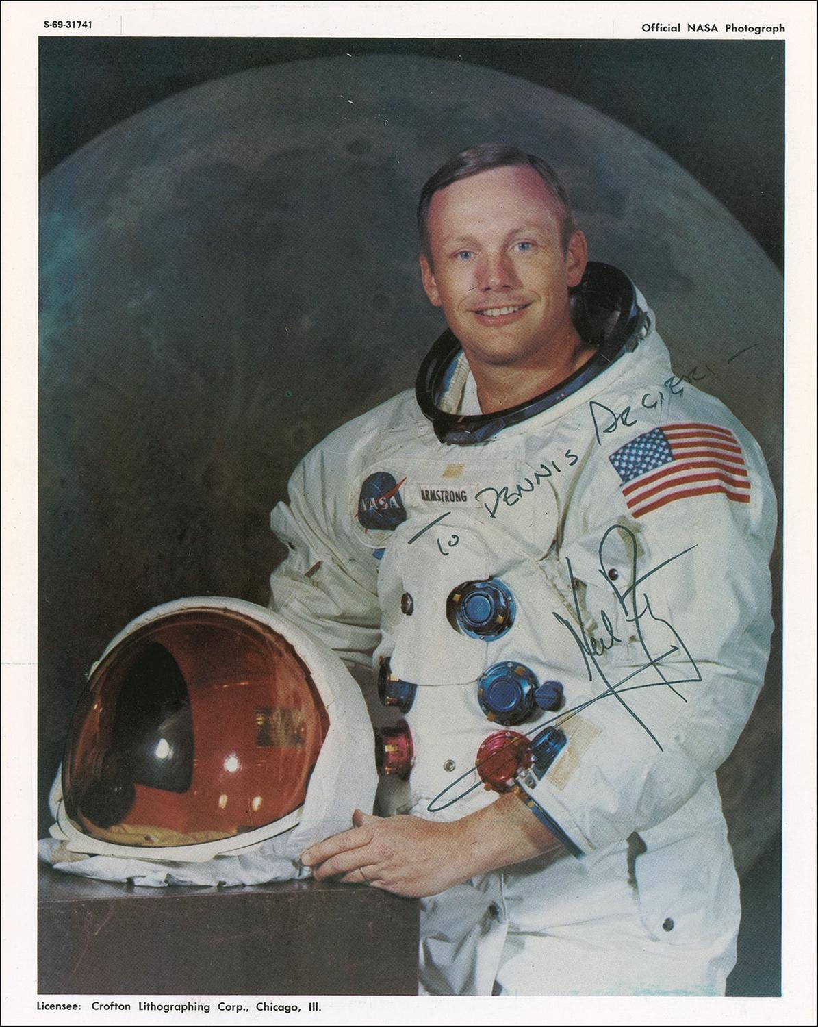 Color 7.25 x 9.25 NASA photo of Armstrong posing in his white spacesuit against a lunar background, signed and inscribed in black felt tip “To Dennis Arcieri—Neil Armstrong.” In fine condition, with a few scattered light surface impressions, and a trivial brush to inscription. An example of unusual size (it is not trimmed), imprinted in the top border “Official NASA Photograph” and in the lower border “Licensee: Crofton Lithographing Corp, Chicago, Ill.”