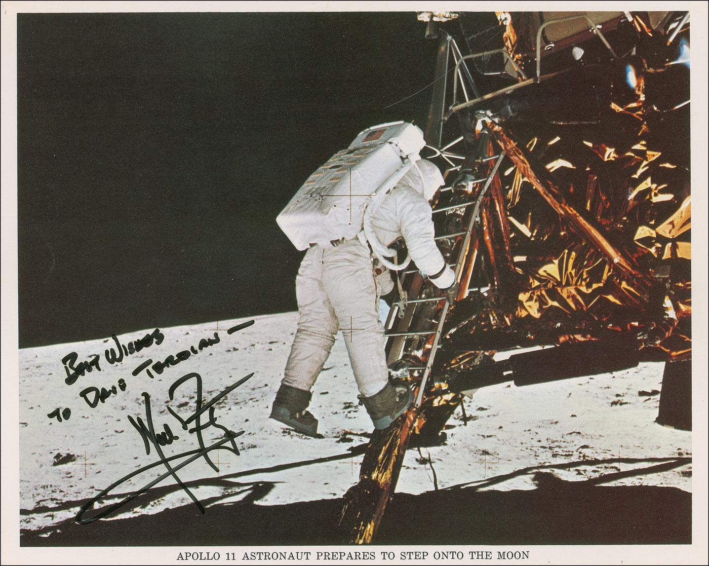 Color matte-finish 10 x 8 NASA photo of Armstrong preparing to step foot onto the moon, signed and inscribed in black felt tip “Best Wishes To Dave Terdian—Neil Armstrong.” In fine condition, with faint yellow haloing to the ink.