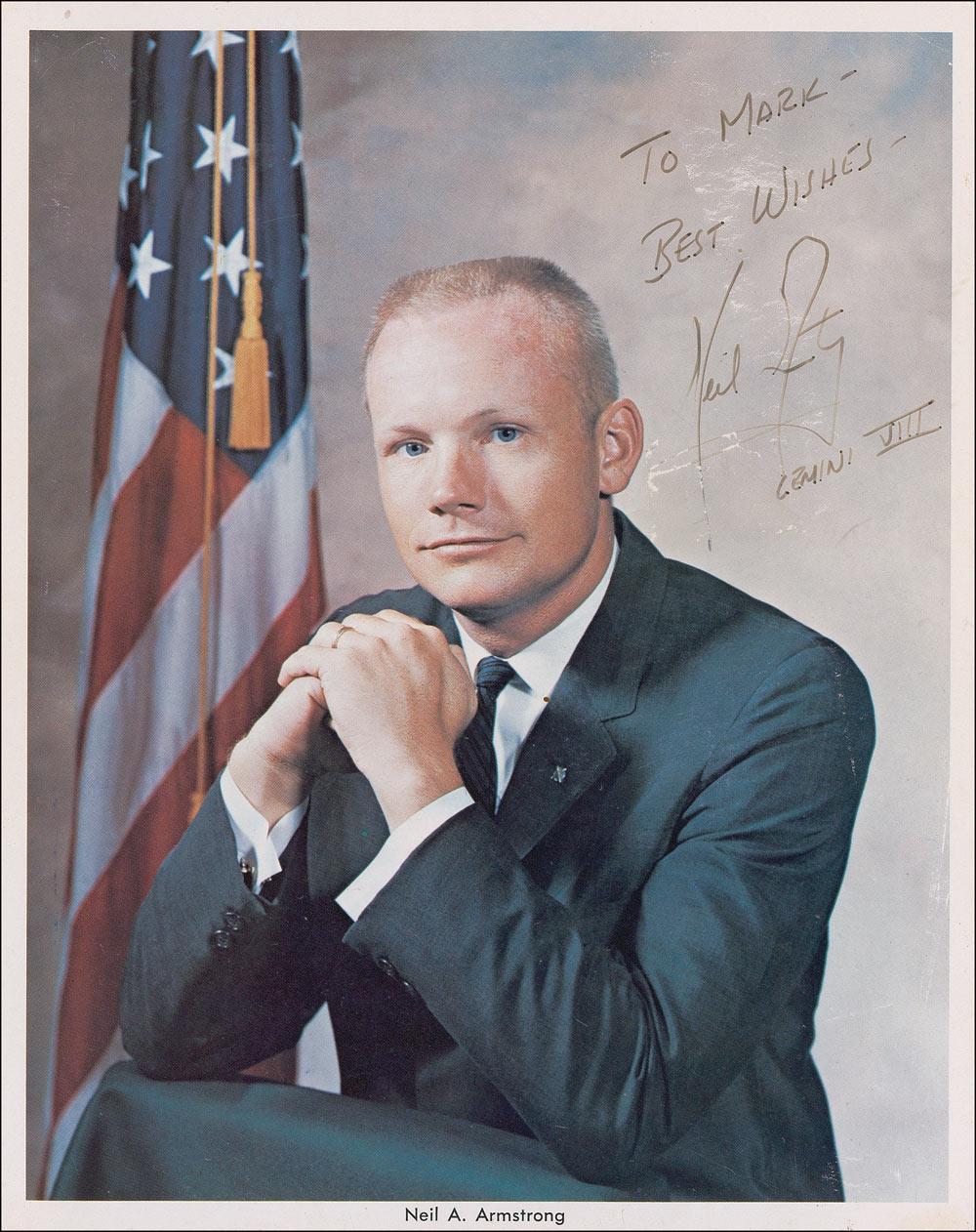 Color vintage cardstock 8 x 10 NASA photo of Armstrong in civilian clothing, signed and inscribed in black felt tip, “To Mark—Best Wishes—Neil Armstrong. Gemini VIII.” In very good condition, with upper right corner crease, surface scratches that touch his face and first name, scattered staining, and an irregular block of soiling. According to the consignor, this photo was originally obtained by a former mayor of Armstrong’s hometown of Wapakoneta, Ohio. A unique sentiment that pre-dates the moonwalker’s involvement with the Apollo program.