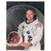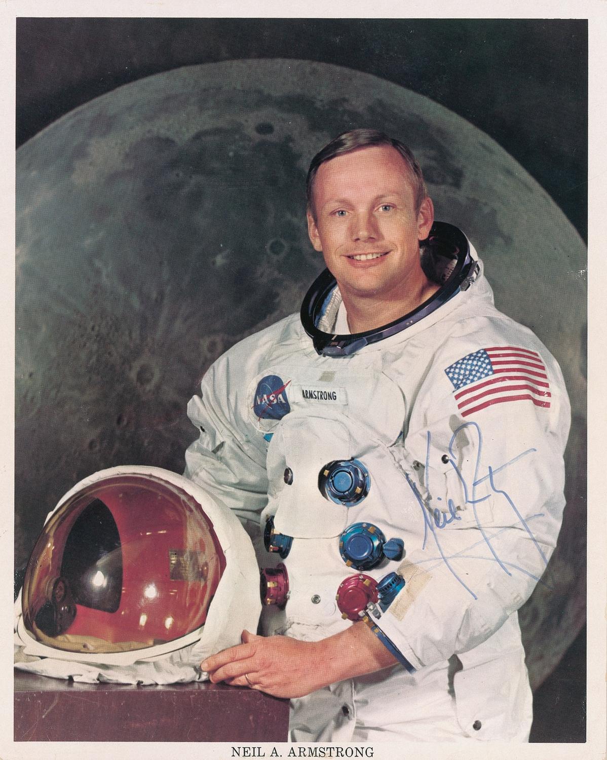Color 8 x 10 NASA photo of Armstrong posing in his spacesuit against a lunar background, signed in blue felt tip. In fine condition, with a few trivial edge dings and creases, not detracting from the overall quality of the photo. Accompanied by a certificate of authenticity from Scott Cornish.