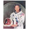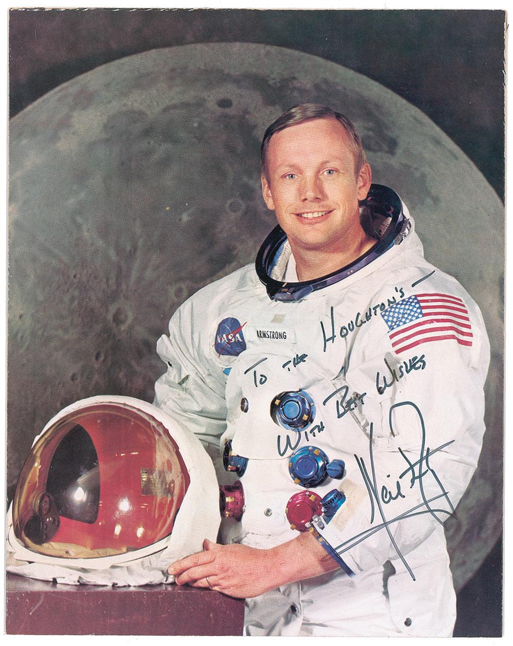 Color 7.5 x 9.5 NASA photo of Armstrong posing in his white spacesuit against a lunar background, signed and inscribed in black felt tip “To the Houghton’s—With best wishes, Neil Armstrong.” Photo is affixed to an identical size piece of heavy cardboard. In fine condition, with trimmed edges.