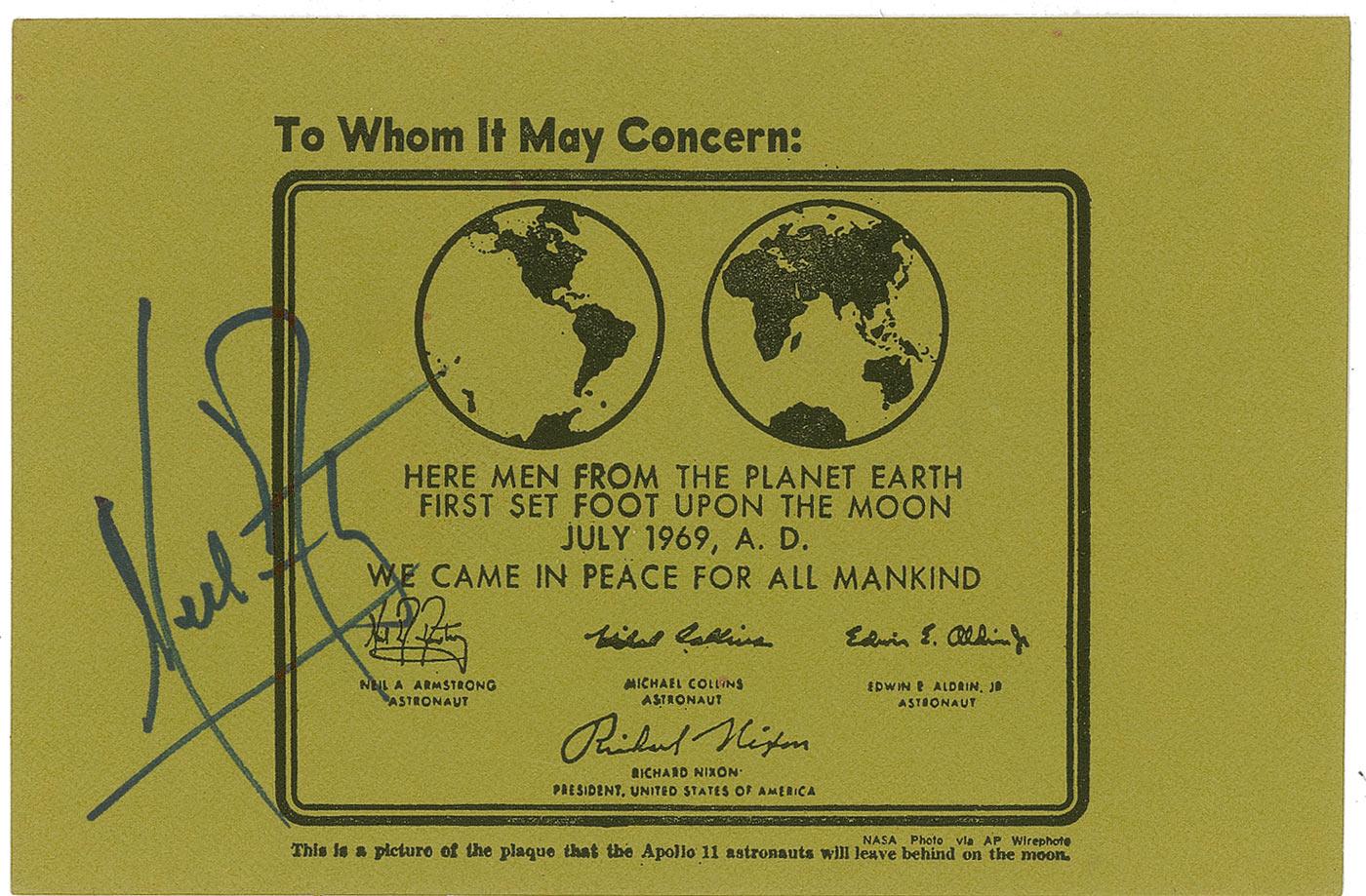 Printed replica of the commemorative plaque left on the lunar surface by the Apollo 11 crew on a light green 5.5 x 3.75 sheet, signed in felt tip by Armstrong. In very fine condition.