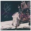 Color satin-finish 8 x 8 photo of Buzz Aldrin descending the ladder of the lunar lander to become the second man on the moon, signed in white artist’s pencil, “Neil Armstrong, Apollo 11.” In fine condition, with lightly trimmed edges, a fingerprint over “Apollo,” and a couple trivial surface marks. A seldom seen image, with superb signature contrast and Armstrong's desirable addition of 'Apollo 11.'