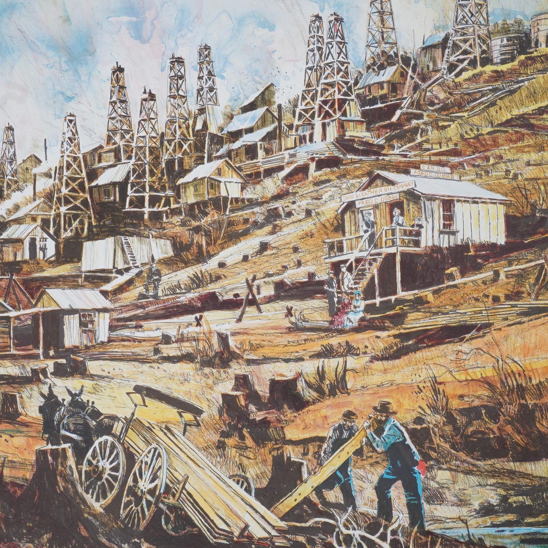Original artist's proof lithograph titled Can't See the Forest by Neil Boyle, known for his vibrantly painted Western subjects. This striking composition depicts an expansive oil drilling landscape with towering derricks, rustic wooden structures, and laborers engaged in physically demanding tasks. The foreground features two workers maneuvering wooden planks near a cart, symbolizing industrial progress at the cost of deforestation. The dramatic contrast of rich earthy tones and bold linework lends the piece a compelling graphic quality, reminiscent of mid-to-late 20th-century American industrial realism. The artist's signature appears in pencil along the lower right margin, with the title inscribed in the center. The print is further marked A/P (Artist Proof) denoting its status as an artist’s proof, making it a unique and desirable collectible.
