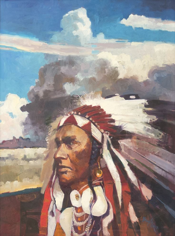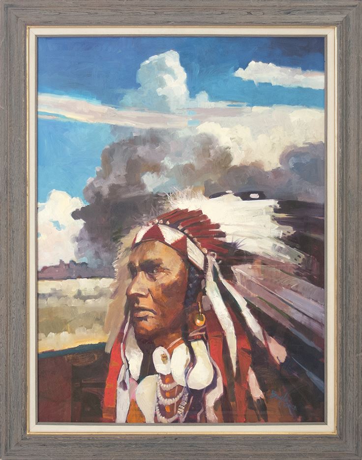 Neil Boyle (1931-2006). Whiteman Runs-Him. 40" x 30" oil on canvas. Signed lower right: Boyle BSWCA. Provenance: Indian River Gallery.