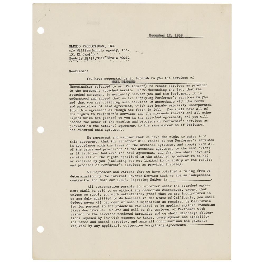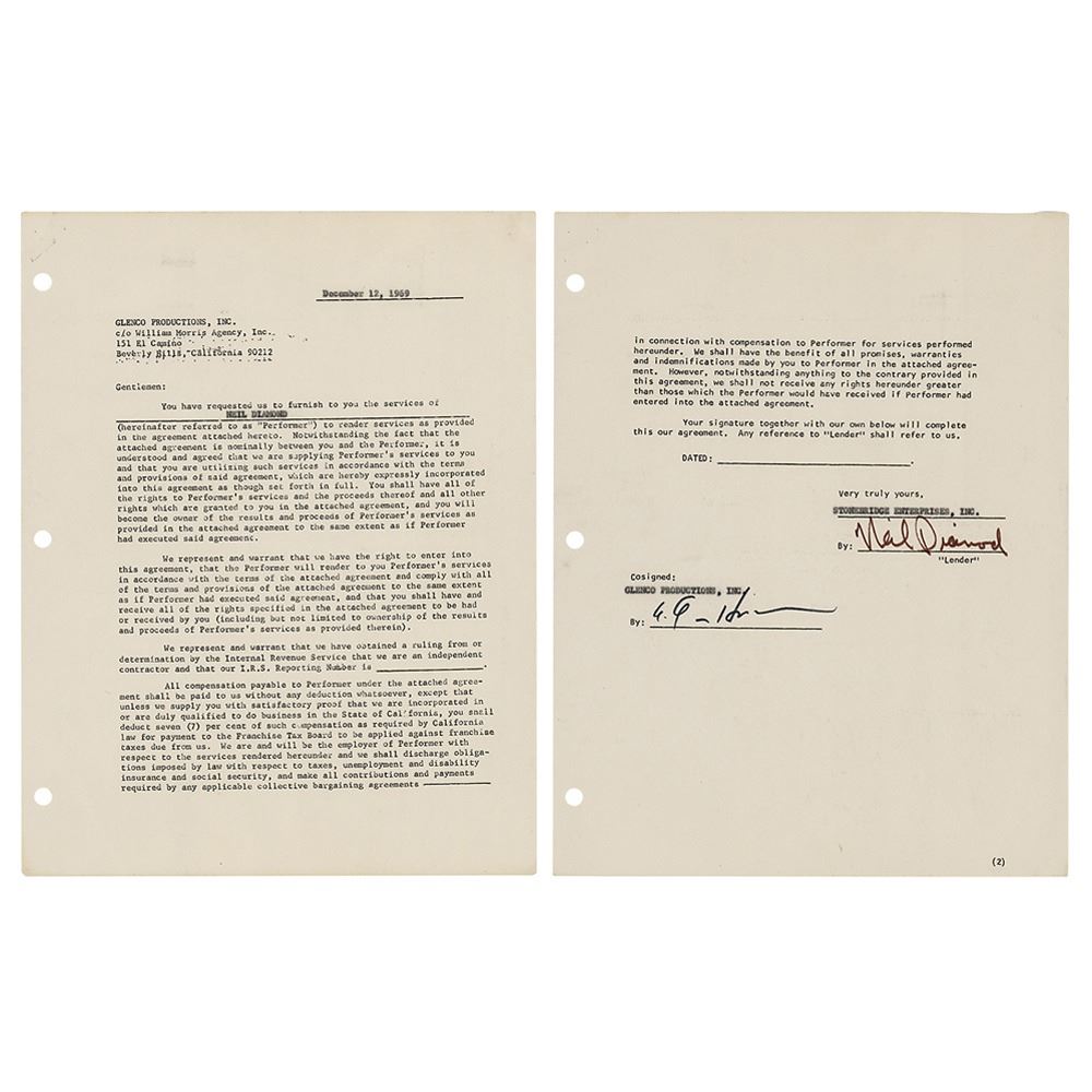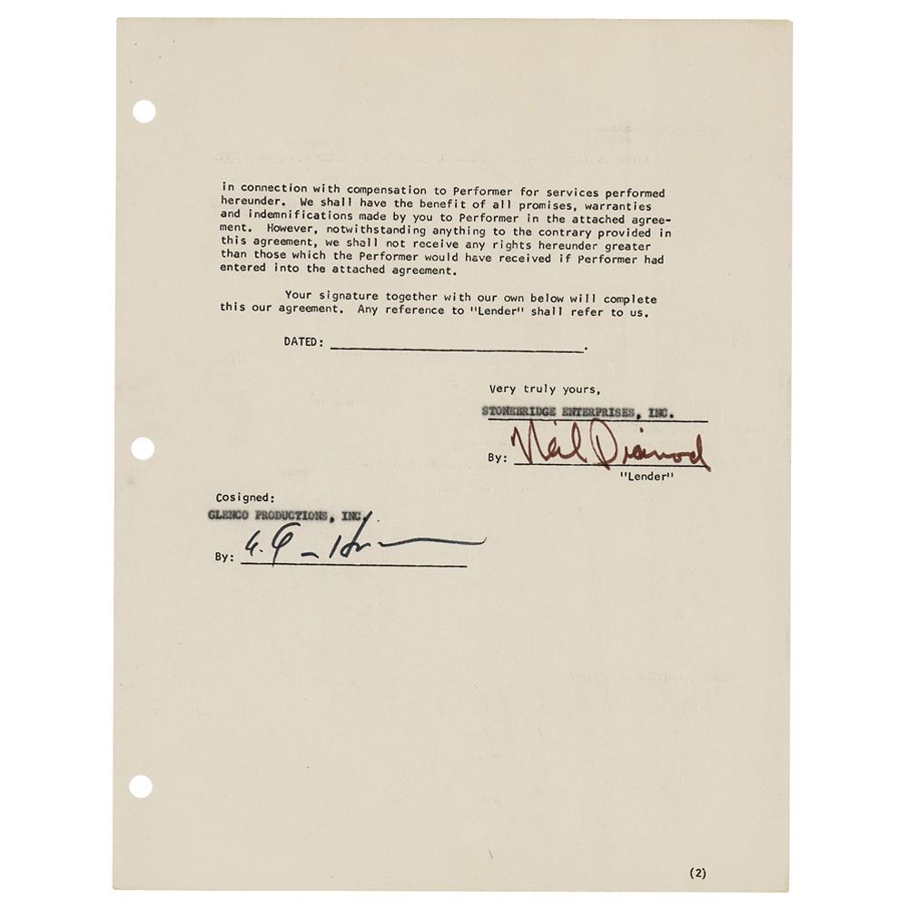Early DS, two pages, 8.5 x 11, December 12, 1969. Supplemental contract between Stonebridge Enterprises, Inc., and Glenco Productions, Inc., regarding rights and compensation for the services of Neil Diamond, who has signed at the conclusion in brown felt tip. In fine condition. A desirable contract that dates to the same year he released his famous hit single 'Sweet Caroline.'