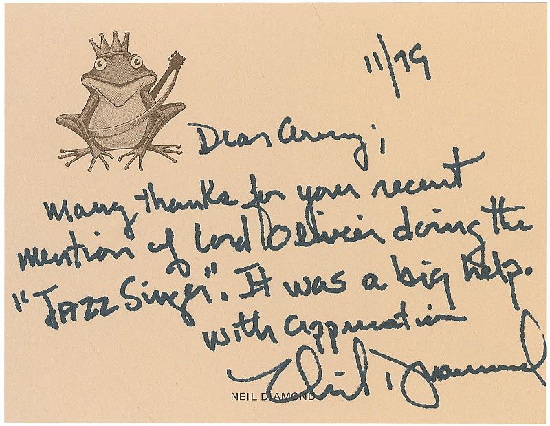 ALS, one page, 5.5 x 4.25, personal letterhead, November 1979. Letter to Army Archerd. In full: “Many thanks for your recent mention of Lord Olivier doing the ‘Jazz Singer.’ It was a big help.” In fine condition. Accompanied by the original mailing envelope which is also signed on its back flap.