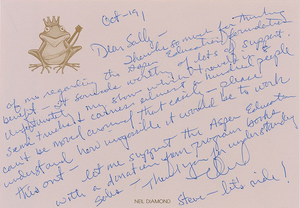 ALS signed “Neil,” one page, 7 x 5, personal letterhead, October 19, no year. Letter to an admirer. In part: “Thanks so much for thinking of me regarding the Aspen Education Foundation benefit—it sounds worthy of lots of support. Unfortunately, my show which travels in 8 semi trucks & carries almost a hundred people can’t be moved around that easily.” In fine condition.