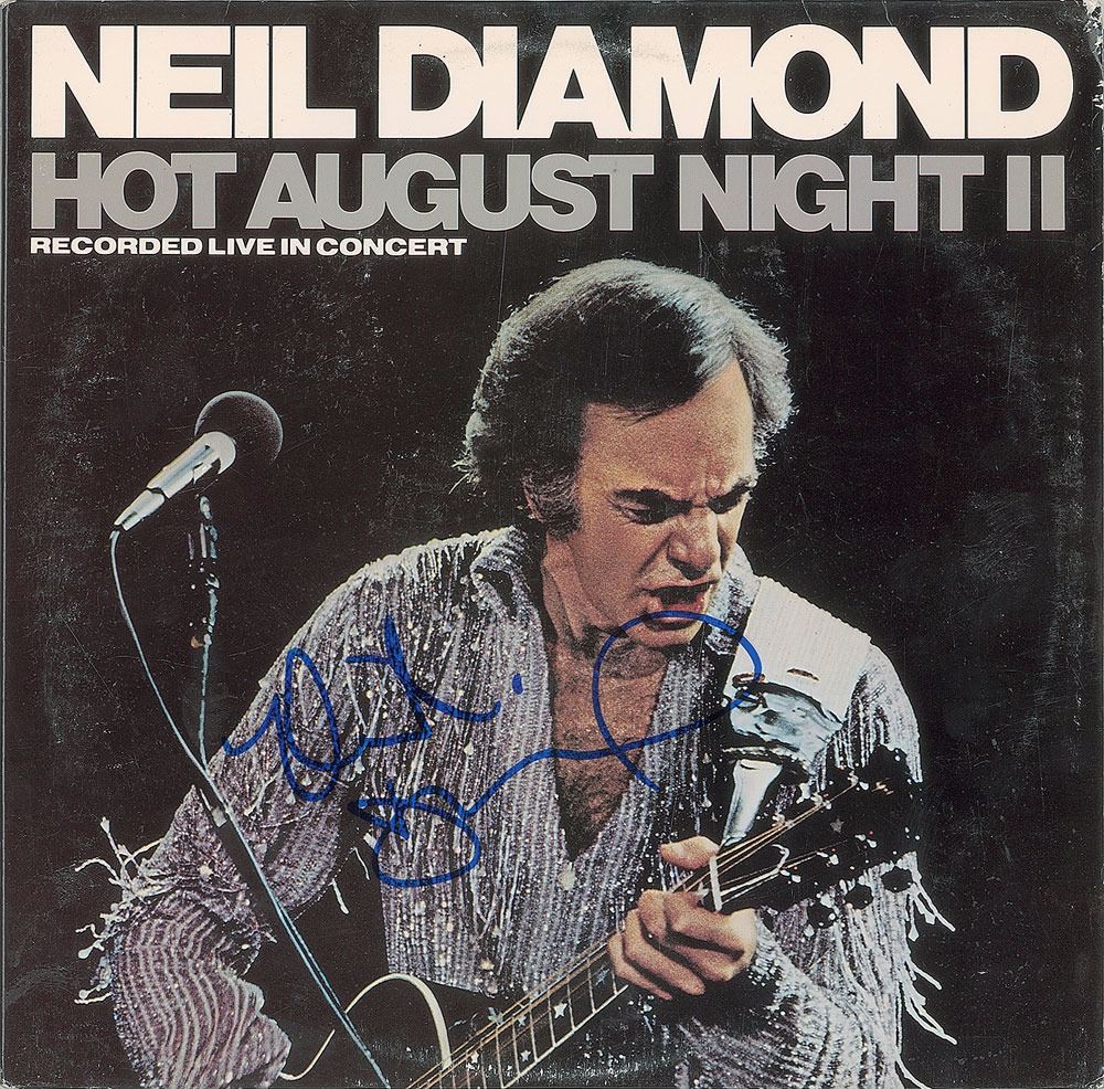 Hot August Night II album signed on the front cover in blue felt tip by Diamond. In fine condition, with usual light scuffing. The record is included. Consignor notes that the signature was obtained at the Fairlawn Hilton in Ohio before his show at the Blossom Music Center.