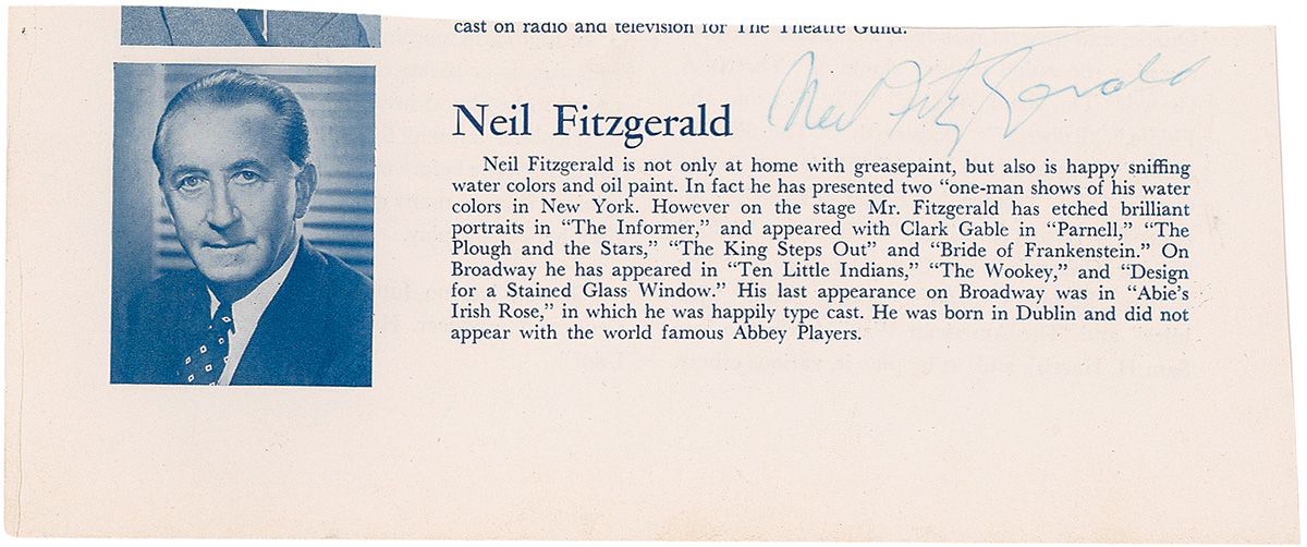 Dublin-born film and theatre actor (1892-1982) who appeared in films such as The Informer and Bride of Frankenstein. Ink signature, “Neil Fitzgerald,” on an 8.5 x 3.5 biography clipped from a magazine page. In fine condition, with a crease to the left edge and signature a shade light.