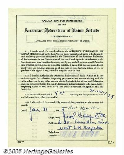 <B>Neil Hamilton Signed Document.</B></I> Holy obscure artifact, Batman! An application for membership in the American Federation of Radio Artists, filled out by character actor Neil Hamilton, better known as Commissioner Gordon on the 1960s "Batman" TV series. Dated January 31, 1938, with Hamilton's signature at the bottom in blue ink. <I>With COA from PSA/DNA.</B></I>