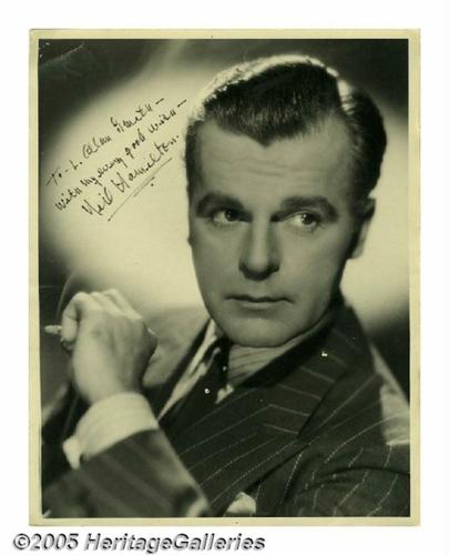 <B>Neil Hamilton Signed Photograph.</B></I> Matte-finish 11" x 14" portrait of the actor as a young man, wearing a pin-striped suit and holding a cigarette, signed and inscribed in fountain pen "To L. Allan Smith, With my every good wish, Neil Hamilton." In fine condition, with very few tiny areas of surface paper loss, tack holes to the top and bottom borders, and a few faint creases. <I>With COA from PSA/DNA.</B></I>