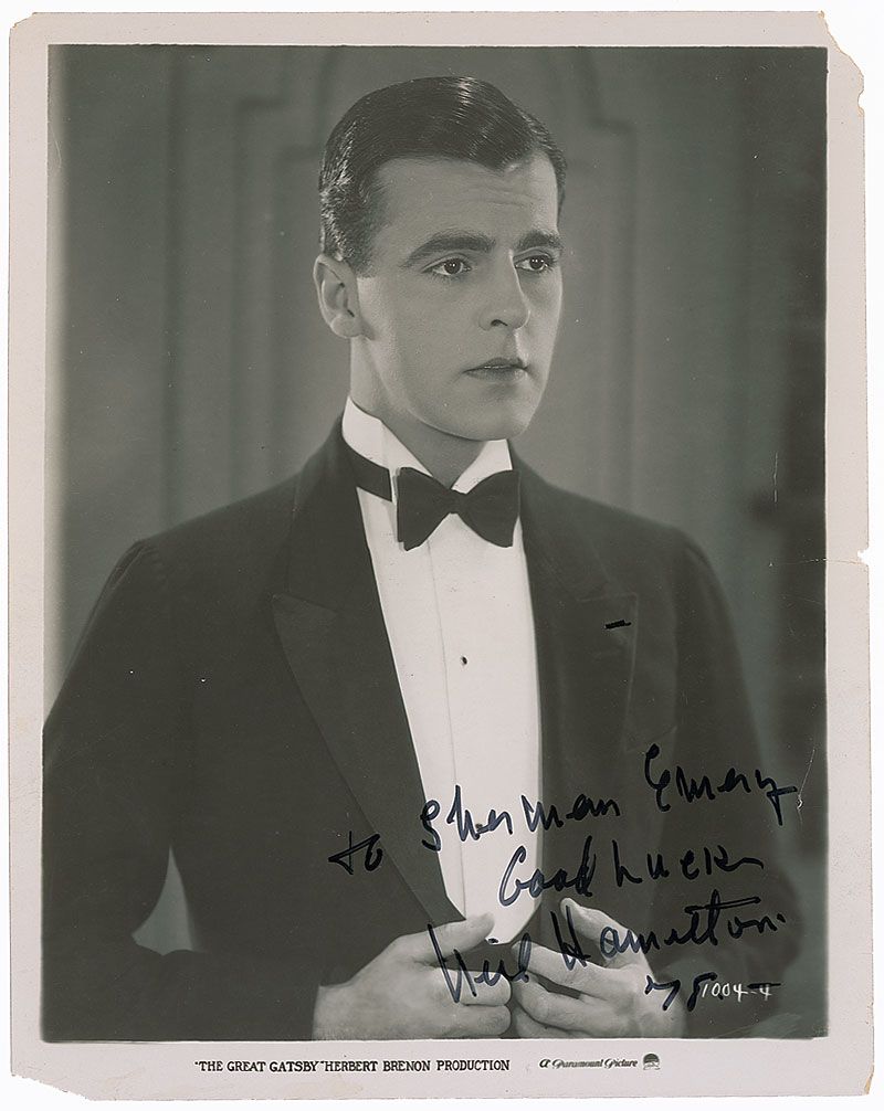 Glossy 8 x 10 Paramount Pictures promotional photo of Hamilton as he appeared in The Great Gatsby, signed and inscribed in black felt tip, “To Sherman Emery, Good luck, Neil Hamilton, ’78”; and a TLS, one page, 5.75 x 7.75, December 27, 1978, in part: “The ‘Great Gatsby’ still brings to mind a director I enjoyed working for, Mr. Herbert Brenon, not that I didn’t enjoy working for ALL of them…My first three were for Mr. D. W. Griffith, starting back in 1922 with ‘The White Rose’—and D. W. was a man I loved, great and FAMOUS as he was, he was also one of the kindest, most gentle people I’ve ever known.” Photo in very good condition, with a noticeable tear to right edge, scattered creases, and paper loss to corner tips; letter in fine condition.