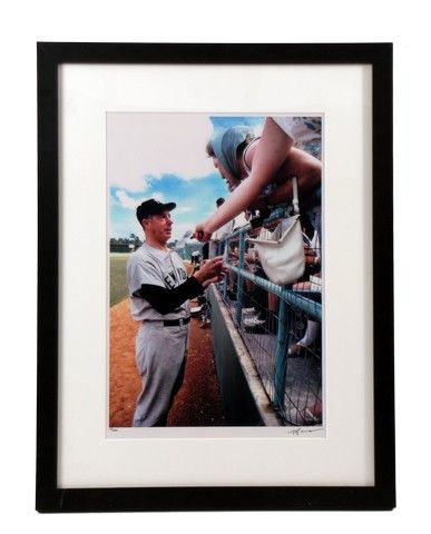 Neil Leifer Signed & Numbered Joe DiMaggio Photo - Neil Leifer is considered one of the greatest sports, political and celebrity photographers of the 20th Century. He sold his first cover photo to Sports Illustrated at the age of 19, and continued to create some of the most iconic sports photos of all time. He moved to Time Magazine where he shot the covers for virtually every living American President, and most of the grand men and women of sports, stage, screen, as well as our biggest heroes of war and peace throughout the world. This is a remarkable and rare oversize stunning color photo Joe DiMaggio "back in the saddle" and suited up at a New York Yankee's game, signing an autograph to a fan. Framed and matte in a museum quality display, it is signed and numbered by Neil Leifer and comes from his studio collection. (Numbered 12/150, the frame is approx. 27 1/2" x 21").
