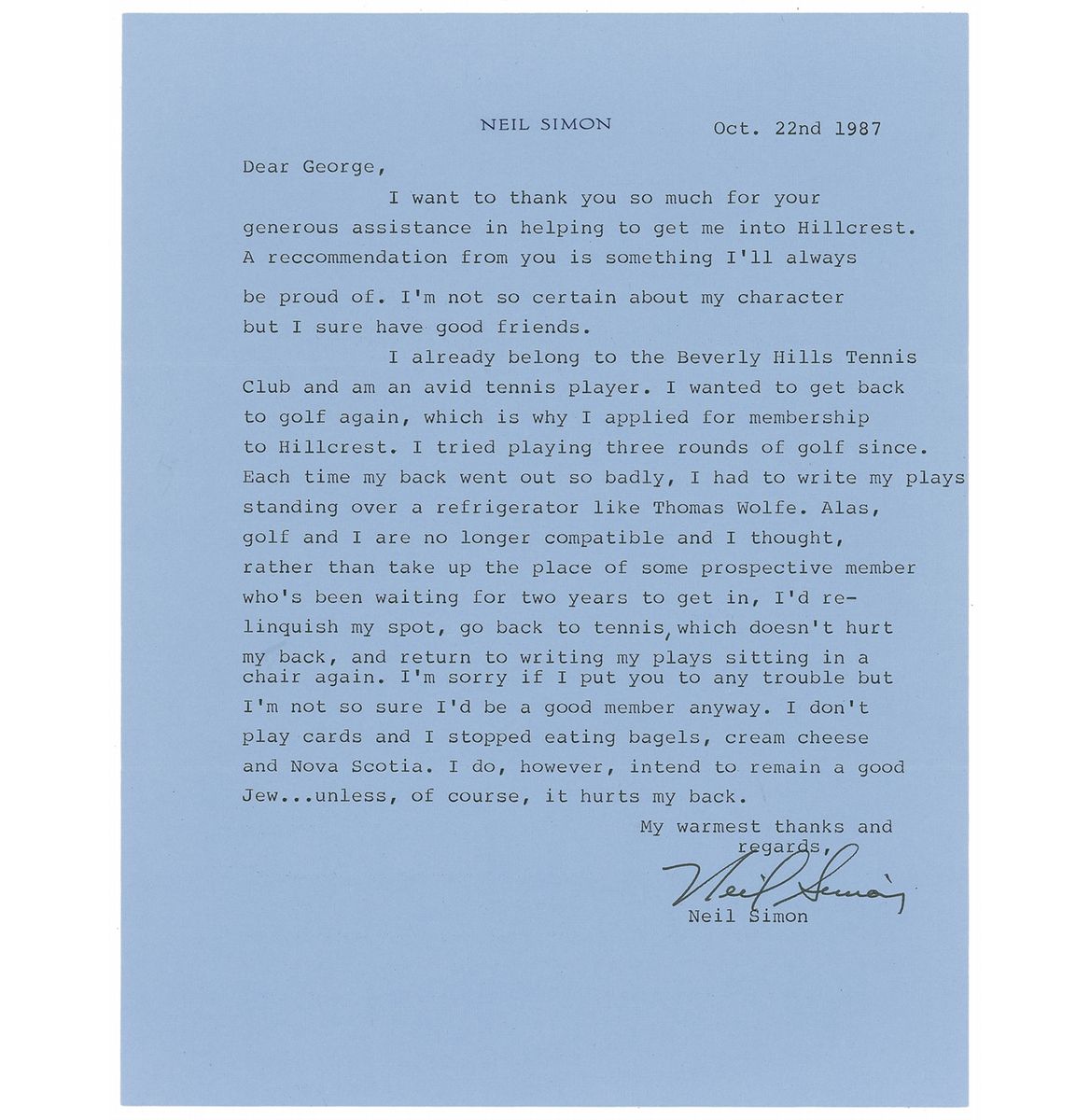 TLS, one page, 7 x 9, personal letterhead, October 22, 1987. Simon writes to George Burns, in part: “I want to thank you so much for your generous assistance in helping to get me into Hillcrest. A reccommendation [sic] from you is something I’ll always be proud of. I’m not so certain about my character but I sure have good friends…I wanted to get back to golf again, which is why I applied for membership to Hillcrest. I tried playing three rounds of golf since. Each time my back went out so badly, I had to write my plays standing over a refrigerator like Thomas Wolfe. Alas, golf and I are no longer compatible and I thought…I’d relinquish my spot…and return to writing my plays sitting in a chair again. I’m sorry if I put you to any trouble but I’m not so sure I’d be a good member anyway. I don’t play cards and I stopped eating bagels, cream cheese and Nova Scotia. I do, however, intend to remain a good Jew…unless, of course, it hurts my back.” In fine condition, with some light creasing.