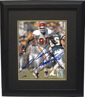 Neil Smith played for the Kansas City Chiefs from 1988 to 1996. One of the top defensive linemen of his era, Smith made the Pro Bowl 6 times during his career (1991 to 1995 and 1997), and led the NFL with 15 sacks in the 1993 season. Smith finished his 13 NFL seasons with 105 sacks, 12 fumble recoveries, 19 return yards, and 1 touchdown. On October 22, 2006, Smith was inducted to the Chiefs' Hall of Fame. Neil Smith has hand signed this Kansas City Chiefs 8x10 Photo. Smith Hologram and Certificate of Authenticity from Athlon Sports. Custom Black Mat and Premium Black Color Frame.